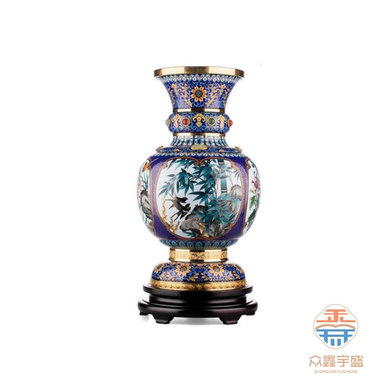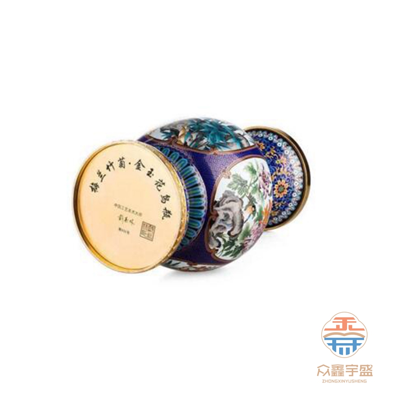 景泰蓝《梅兰竹菊金玉花鸟瓶》由景泰蓝泰斗戴嘉林倾50年功力创作而成。整件作品花鸟环绕四周,寓意中华儿女奋发进取,富贵绵长。周身镶嵌有名贵玉石松石、翡翠、并且大面积鎏金,比肩旧时皇家景泰蓝之奢华。又进一步展现了炎黄子孙坚韧不拨,勇攀高峰的优良品质。整件作品庄重典雅,精美华贵。卓尔不凡,具有极高的艺术价值、文物价值和收藏价值。掠过未来价值的提升,它留下的还有一份对中华儿女求学、从政、经商以及建设美好家庭等的厚重精神祝愿。