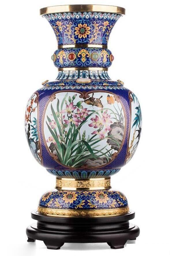【藏品名称】: 景泰蓝梅兰竹菊金玉花鸟瓶 【藏品尺寸】: 高约51.8cm