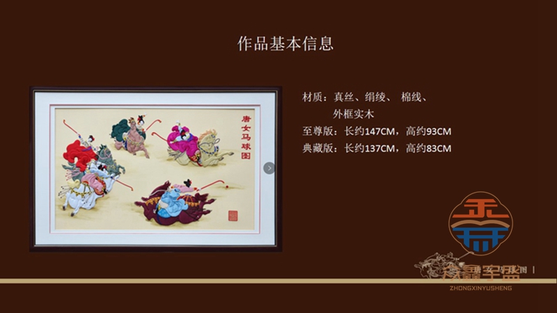 【藏品名称】:宫廷补绣 唐女马球图 【藏品规格】: 至尊版:长约147CM,高约93CM 典藏版:长约137CM,高约83CM 【藏品材质】:真丝、绢绫、 棉线、外框为实木 【创作大师】:贾大双