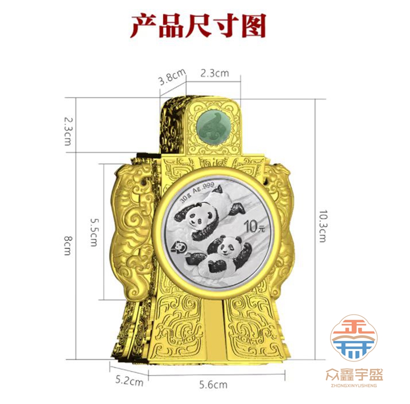 《2022中华壬寅国宝币玺》 《2022中华壬寅国宝币玺》选用中国最早的金属货币之一 —— 布币,为主体造型进行立体呈现,分为布首与布身两部分。布首分别以翡翠或和田玉为主体。布首正面中心位置镶嵌一枚2022版熊猫贵金属纪念币,布首背面中心位置雕刻“虎”字,布首其余位置雕刻海水纹。布身为锌合金镀金镶嵌玉雕,正面居中正位镌刻“中国币玺” ,背面居中正位镌刻 “贰零贰贰”,并雕刻中工美集团及logo。布身两侧镶嵌翡翠或和田玉雕刻的“福虎”,原型取自故宫博物院馆藏的春秋战国时期文物。布身通体雕刻饕餮纹,代表中国智慧与中国精神,象征中华优秀传统文化是国人文化自信的根基。布足底部为玺印,镌刻四字印文“国之币宝”,以纪念中国人民银行“熊猫国宝币”发行40周年。