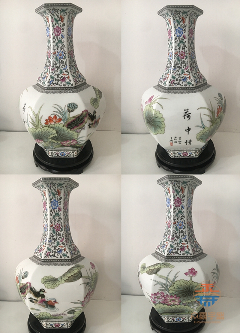 和天下六方镶器粉彩对瓶 ,《荷塘清趣瓷瓶》《水点桃花瓷瓶》张松茂 徐亚凤大师共同创作。