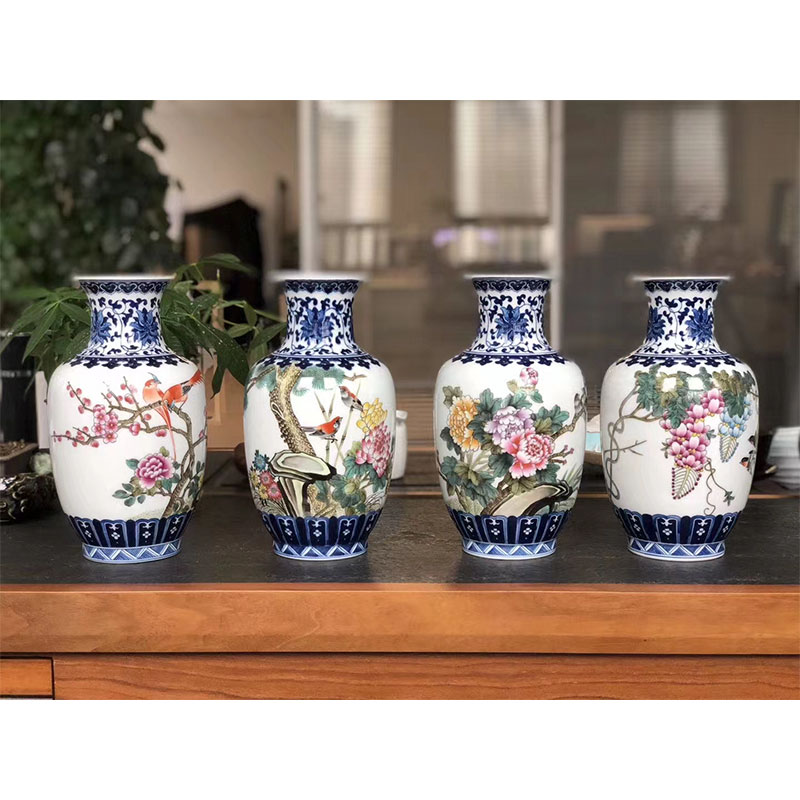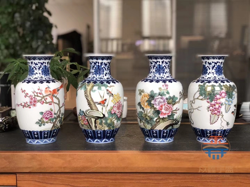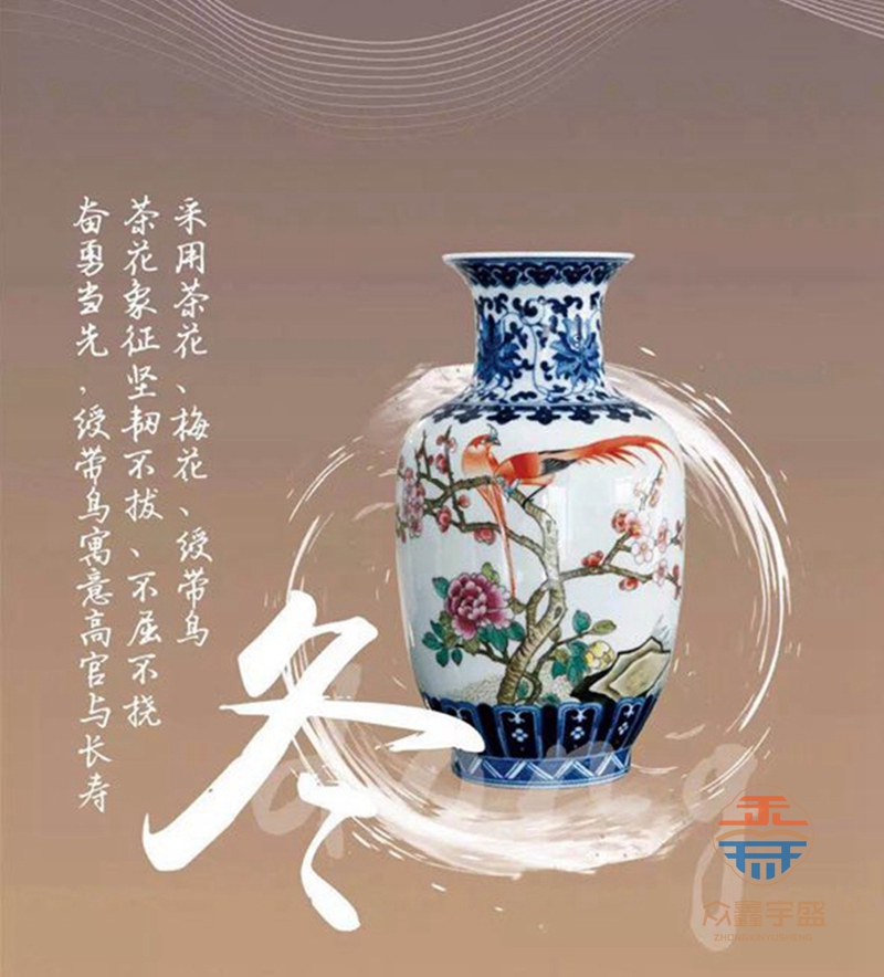 【藏品名称】:四季花鸟粉彩瓶 【藏品规格】:高约25cm、口径约9cm、腹径约15cm、足径约8cm 【创作大师】:张景寿 张松根
