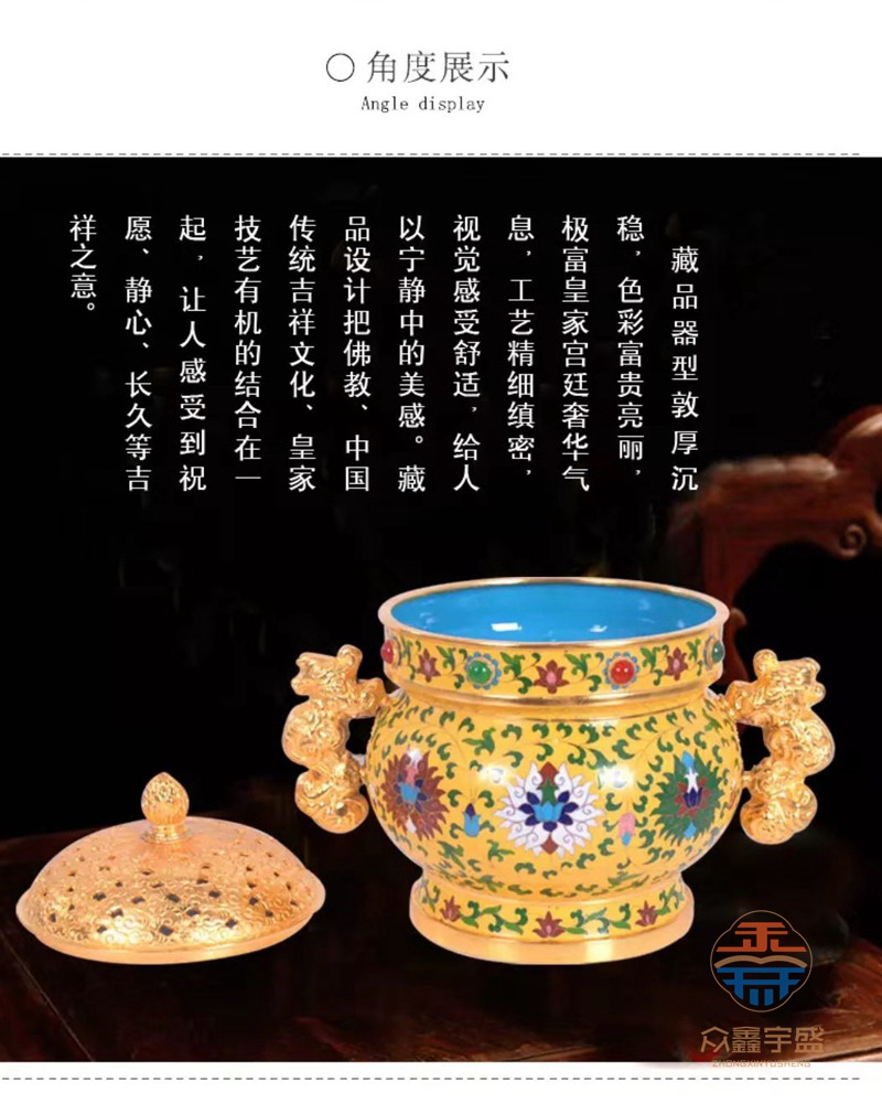 【藏品名称】:掐丝珐琅缠枝莲纹龙耳薰 【藏品材质】:铜胎、表面9999纯金 【藏品尺寸】:高23公分,直径25公分 【创作大师】:刘永森 刘瑞林