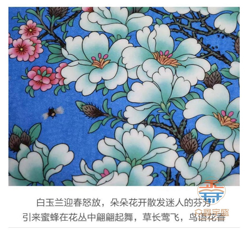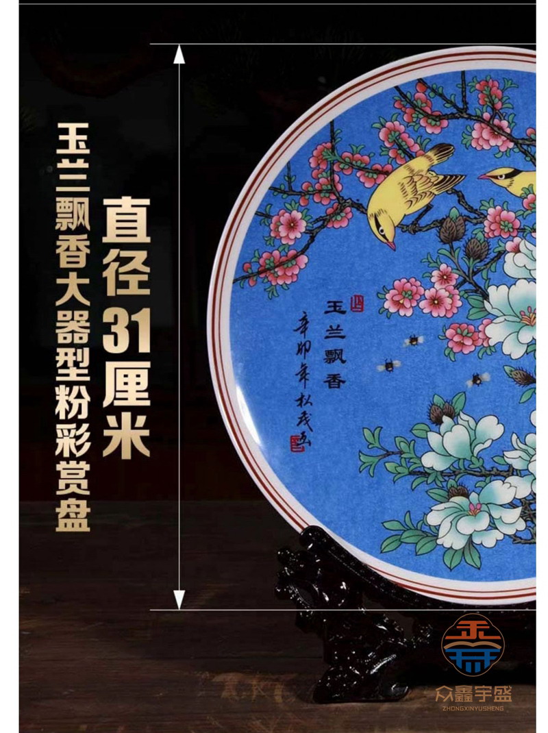 【藏品名称】:玉兰飘香粉彩瓷盘 【藏品尺寸】:直径31cm 【藏品工艺】:手绘粉彩