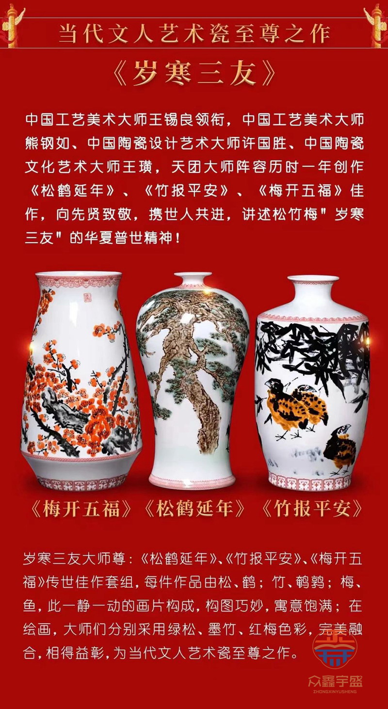 【名称】《松竹梅—岁寒三友》 【大师】王锡良、王璜、许国胜、熊钢如 【尺寸】高35cm,肚径21cm,15cm,21cm