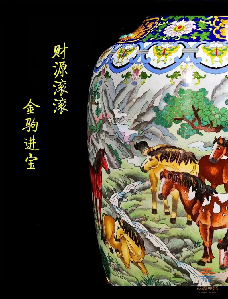 【藏品名称】:景泰蓝《马到成功·金驹进宝》灯笼尊 【藏品创作】:戴嘉林(中国工艺美术大师) 【藏品规格】:高64CM宽34CM口径23CM足径24CM