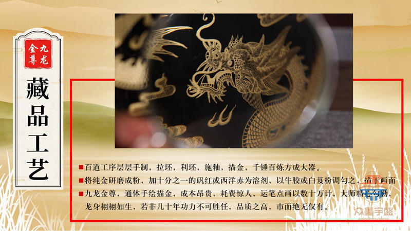 《九龙金尊》首次是王锡良和其子王采联袂创作,首次采用黄金手绘,紫禁城九龙图案,拍卖过亿的鹿头尊造型来表现的《九龙金尊》,配以景德镇最稀有珍贵的乌金釉,堪称陶瓷史上一座铭记丰碑。