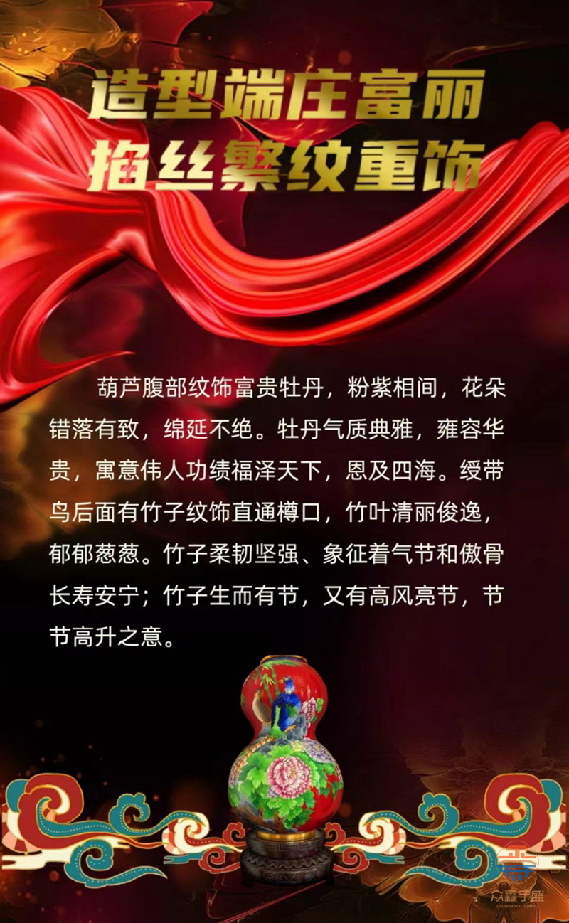 福禄樽器型为葫芦型,连底座总高50厘米,樽体高40厘米,腹径28厘米左右。主体红地为主,圈口錾金,连接蓝地如意纹,樽体满铺万胜纹,主题由一对吉祥的绷带鸟,牡丹、竹子等图案组成。