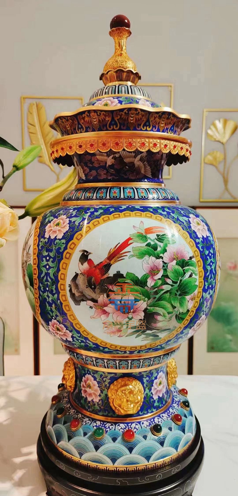 【藏品名称】:盛世升平·中国尊 景泰蓝盛世升平中国尊在设计创作上面也是有着独特的寓意,选取的每一处花纹都是吉祥的象征,比如花卉选择了国花牡丹、香港市花紫荆花、澳门市花荷花以及台湾省花梅花;禽鸟方面选择了白头鸟、绶带鸟、鹭鸶和喜鹊。这两种意象组合起来寓意“富贵白头”“和美长寿”“一路连升”“喜上眉梢”,都是中华传统文化中吉祥美好的代表。同时,四面开光的设计也寓意改革开放四十年的辉煌成就。开光下方的四个雄狮镶嵌,更表达了中国崛起,威震四方的寓意。
