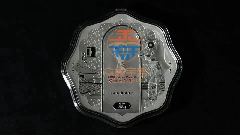 《卡塔尔世界杯纪念银盘》 2022年世界杯官方授权商品 亚洲钱币设计第一人——余敏创作 世界杯元素与中东元素相结合 八芒星为创意源点,高浮雕足银铸造