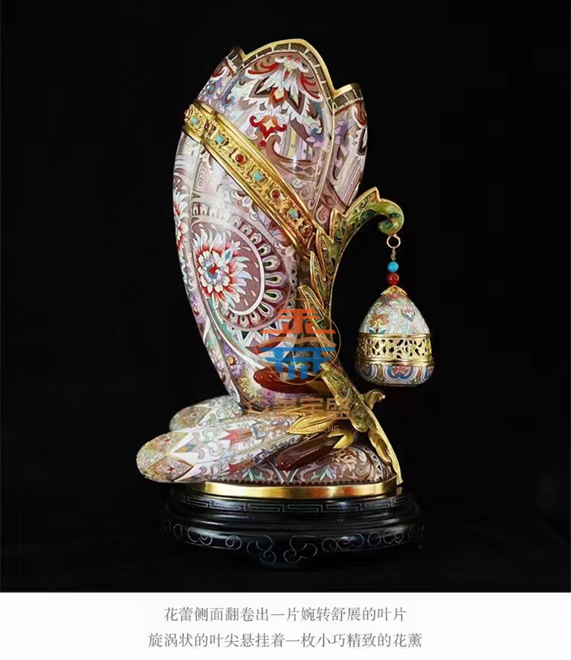 【藏品简介】:作品硕大的花蕾呈现出一条优美的弧线,宛如少女曼妙的腰身;花蕾侧面翻卷出一片婉转舒展的叶片;旋涡状的叶尖悬挂着一枚小巧精致的花薰。作品造型挺拔俏丽、构思巧妙、色彩典雅。花蕾镶嵌了多种珍贵玉石,把作品衬托得更加高雅、名贵、生机勃勃。