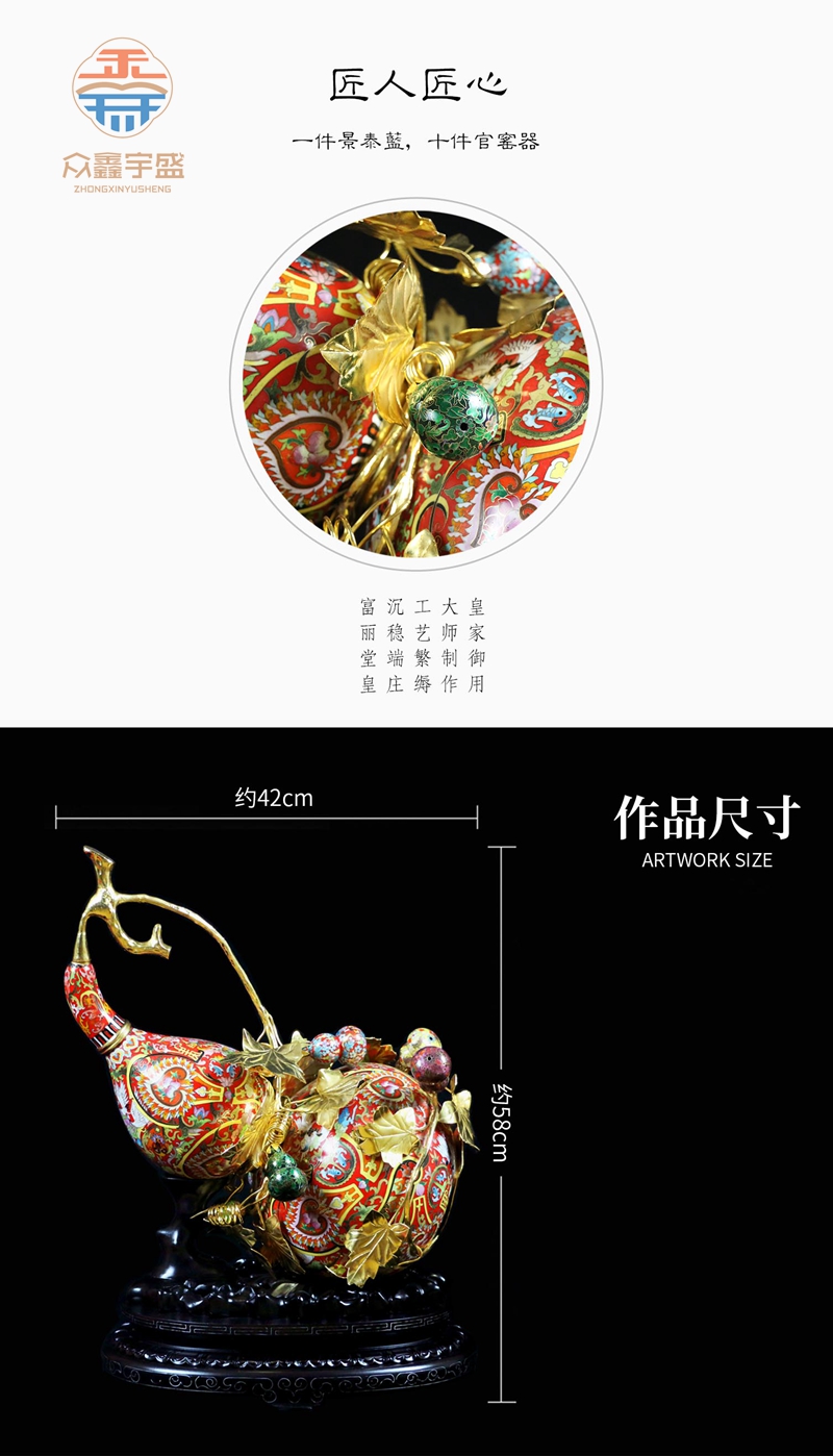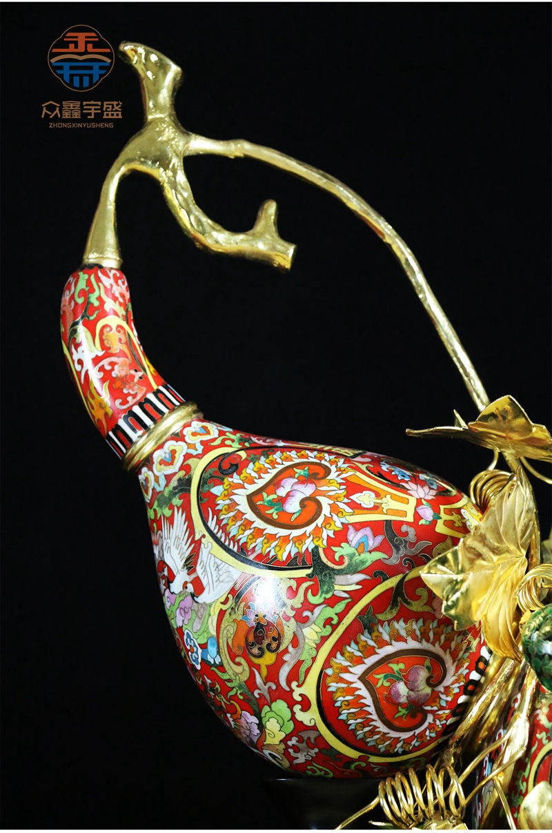 葫芦自古以来被视为吉祥富贵的象征,万代吉祥葫芦景泰蓝作品以葫芦为造型,以福、寿、财为主题,金色的藤条瓜叶枝蔓缠绕着景泰蓝大葫芦,葫芦枝蔓挂着景泰蓝与宝石相结合制成的小葫芦,巧妙组合在一起。色彩靓丽典雅,令人耳目一新;寓意为多福多寿,平安吉祥。