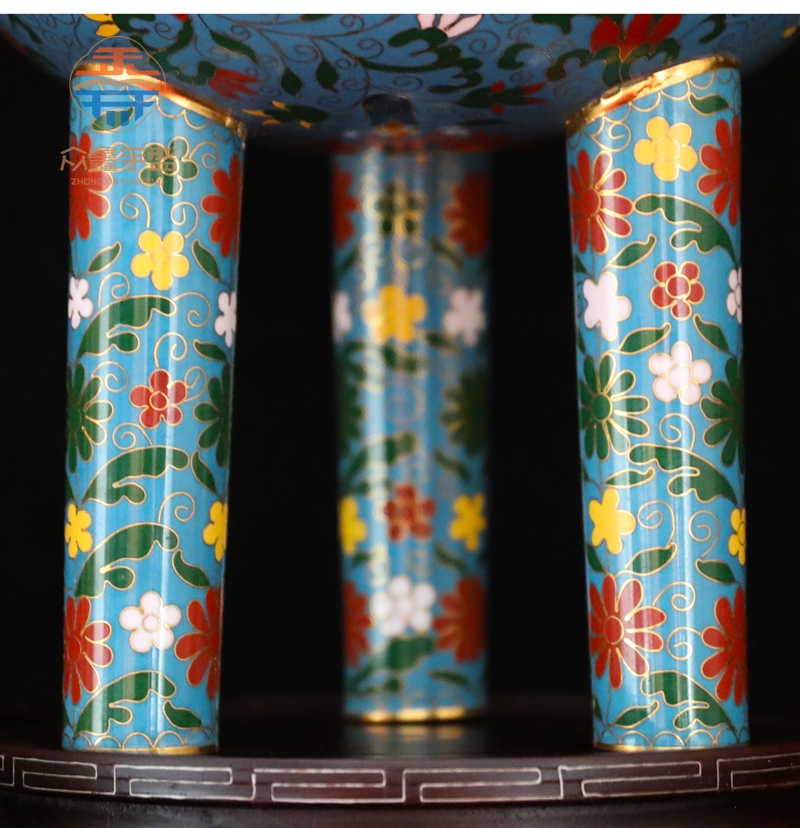 3、作品通体饰掐丝珐琅花卉纹,炉腹上部以一道弦纹线将炉体图案界分两部分,线上部分以绿色珐琅为地,饰白色菊花纹12朵;线下部分以蓝色珐琅,饰缠枝莲花纹6朵;三足均以蓝色珐琅为地,饰彩色菊花纹。