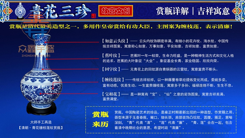 【藏品名称】:青花三珍 【藏品规格】:青花折枝花果纹梅瓶: 宽度:约22cm 瓶高:约34cm 重约:3.2kg 青花八宝纹双耳宝月瓶:宽度:约24cm 瓶高:约35cm 重约:2.6kg 青花缠枝莲纹赏瓶:宽度:约20cm 瓶高:约34.5cm 重约:3.4kg 【限量发行】:2020套