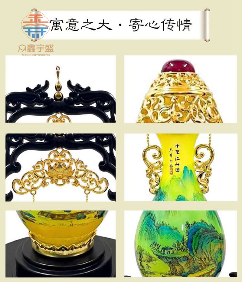 以皇家绝技花丝镶嵌与内画技艺相结合,完美的将传承百年的内画技艺与传世千年的国宝名画完美融合再创时代重器,集内画,花丝、镶嵌、錾刻、鎏金。等非遗技巧,以链瓶的形式展现出来,具有连绵不息,江山千里,万代千秋的美好寓意。是艺术价值极高的传世收藏之作。