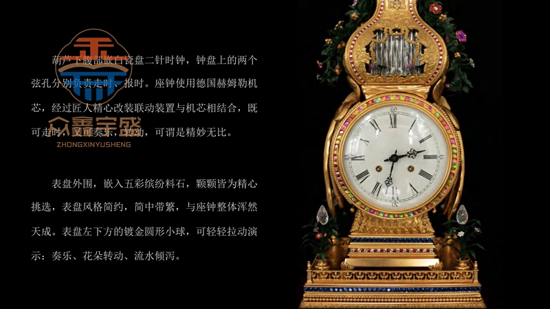 【藏品名称】:钟声平安·铜镀金葫芦式水法钟 【藏品规格】:高84.5cm*长41cm*宽37.5cm(含底座) 重27.85kg 【创作老师】:秦世明 张德宝 德国“赫姆勒”机芯改装机械联动机芯