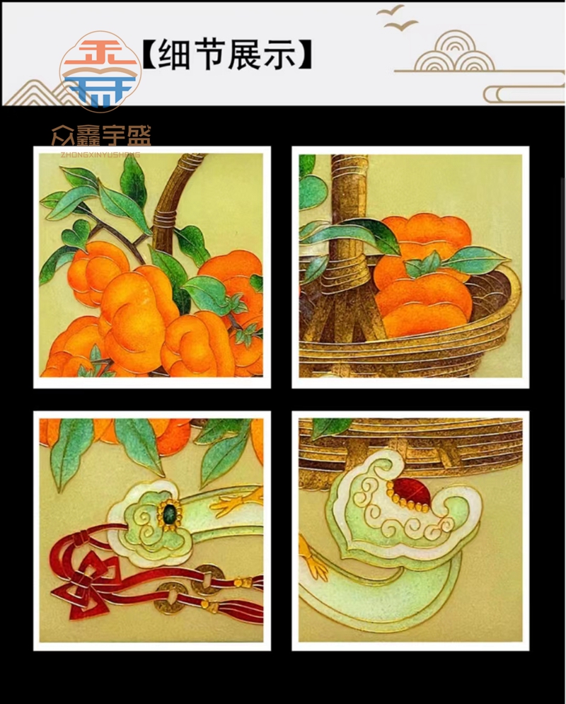 【藏品名称】:《事事如意》掐丝珐琅画 掐丝珐琅画是中国600年国粹景泰蓝技艺传承与创新的结晶。景泰蓝的制作技艺是中国首批列入国家级非物质文化遗产名录的国粹技艺,有着深厚的历史文化底蕴。其核心工序是用掐丝和点蓝,在依照明清皇庭古法手工制作的基础上融合了现代油画、彩嵌等中西方表现技法,取材合金丝及天然矿物宝石粉末,纯手工制作,经设计,描图,掐丝,点蓝,封面等十几道特殊工序制作而成。每一幅作品都是纯手工精心制作而成。