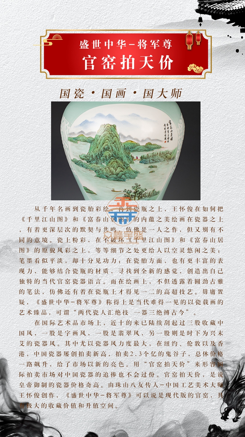 【藏品名称】:《盛世中华-将军尊》 【藏品作者】:王怀俊 【制坏大师】: 余年生 【藏品工艺】: 粉彩