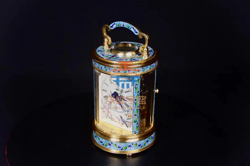 此款座钟原物为清宫旧藏,提梁钟一直以小巧精致著称,在十九世纪初期可以挂在行进的马车上使用,也称作马车钟。提梁钟外观造型,以方形居多,这款提梁钟外观造型为圆亭式。其外观如成人的手掌大小,可以抱于怀中,在清朝时期进入国内后,形象的称之为“五方亮”,是因为皮套钟外壳的前、后、左、右以及顶上都使用透明透亮的玻璃,五面透亮。