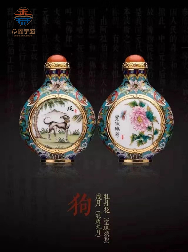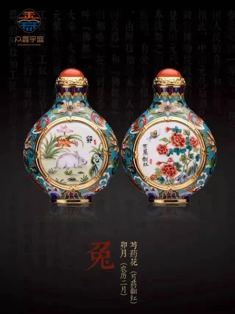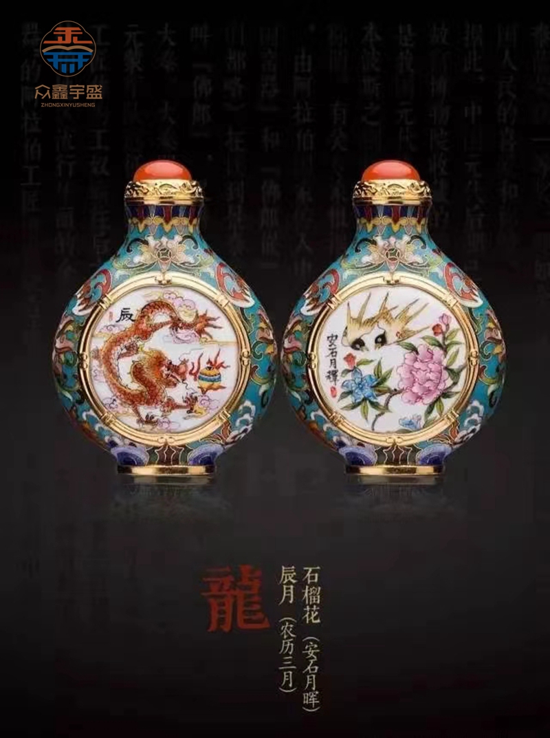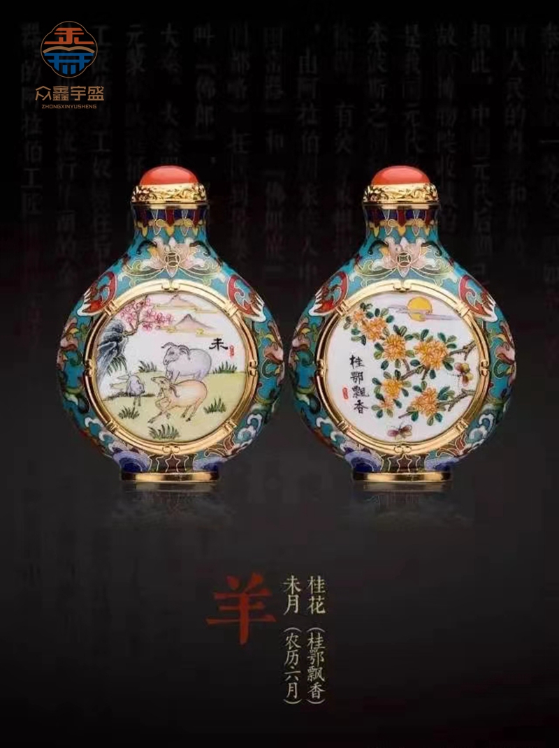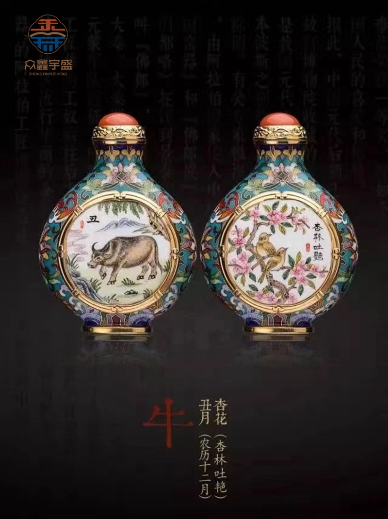 【品 名】:《十二花神生肖》珐琅鼻烟壶 【品 类】:珐琅鼻烟壶 【材 质】:紫铜 南红玛瑙 【工 艺】:铜胎掐丝珐琅 铜胎画珐琅 【规 格】:高8.2cm 宽5.8cm 厚3cm(单只)