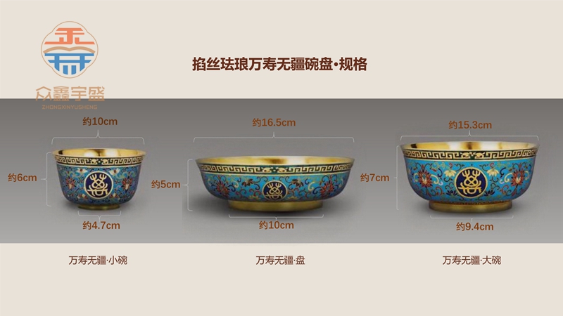 《万寿无疆》掐丝珐琅碗、盘,以故宫藏品为原型,由故宫文创研发交流中心授权出品发行,是中国工艺美术大师米振雄为庆祝紫禁城建成600周年,以传承自故宫的皇家御工艺——掐丝珐琅制作而成。
