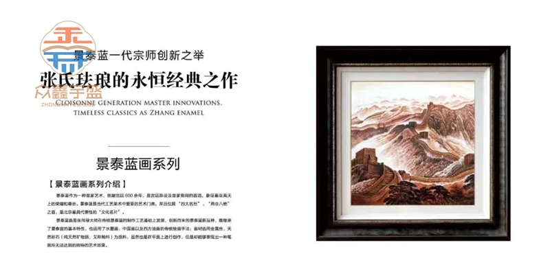 【藏品名称】:景泰蓝珐琅画《万里长城》 国家级非物质文化遗产“景泰蓝技艺”代表性传承人、中国工艺美术大师张同禄以独特的掐丝珐琅工艺的《万里长城图》。
