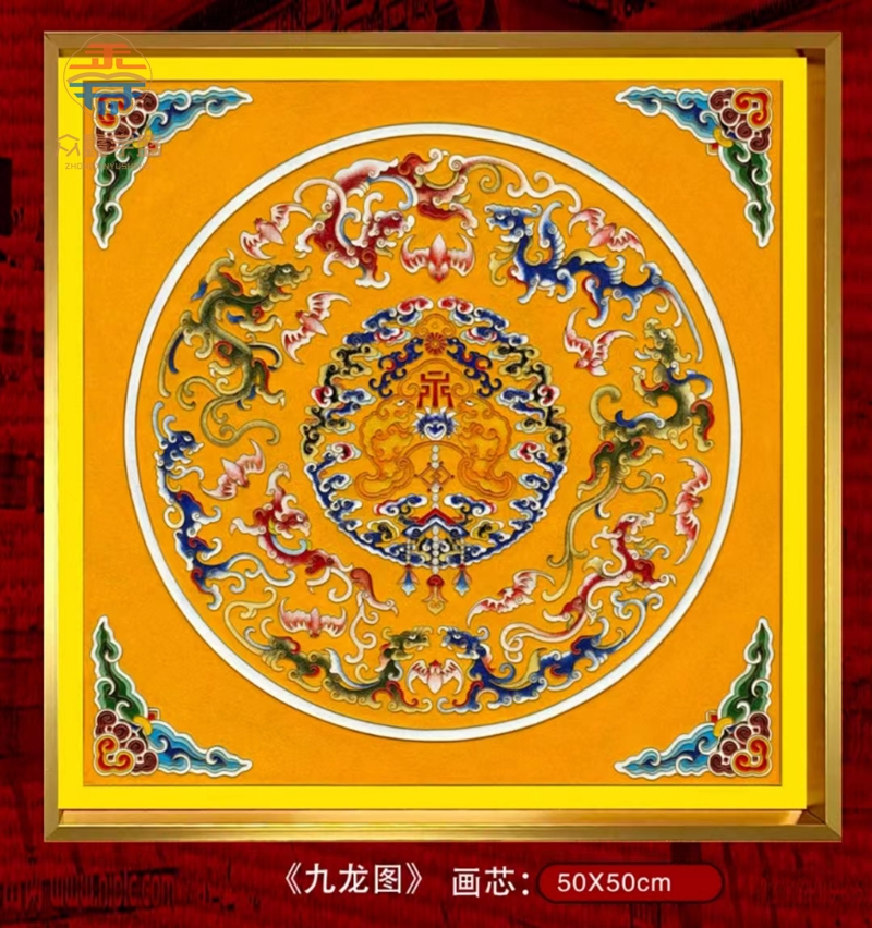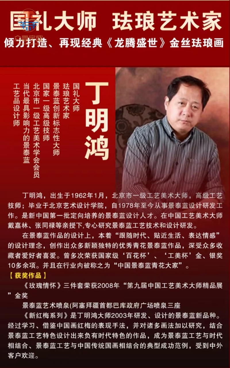 【藏品名称】:《龙腾盛世》金丝珐琅画 【藏品作者】:丁明鸿 【藏品规格】:《金龙送福》50×50cm,《九龙图》50×50cm