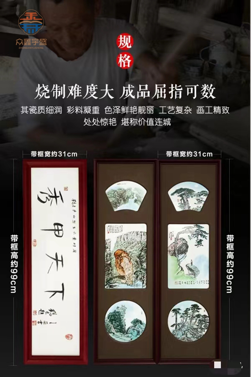 王采大师采用王氏独创的“青绿山水”技法为主要表现形式,集陶瓷技法与国画技法达成于一身,采用流、擦、点、染之法,造就了气势宏大、自然天成的锦绣山河。