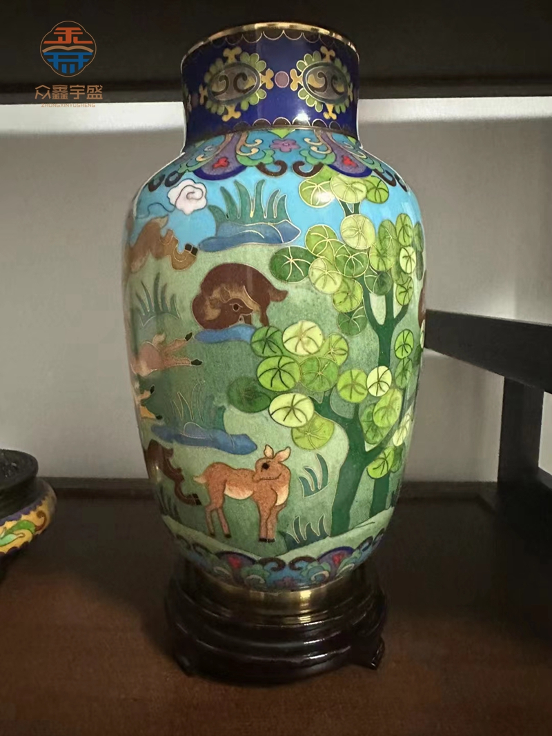 景泰蓝瓶《福寿康宁》刘瑞林大师匠心打造!总高: 26cm,周身刻画“鹿”和“发财树”,“发财树”和“鹿”是中国传统文化的象征,“鹿”是神奇之物,吉祥之物。它不仅是先民崇拜的图腾,还成为生命力旺盛的标志和升官发财的象征。代表着"富贵吉祥、福寿康宁”的寓意,“发财树”顾名思义,是象征着生意兴隆,财源滚滚的一种树"发财树”和“鹿”一起的寓意是“生财有路、吉祥发财”,鹿又与禄”是同音字,所以也象征着富贵官禄的含义,代表着富贵和权利发财树寓意财源广进,鹿和发财树寓意升官发财富贵。
