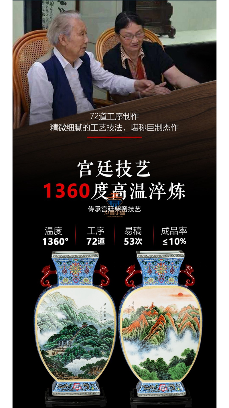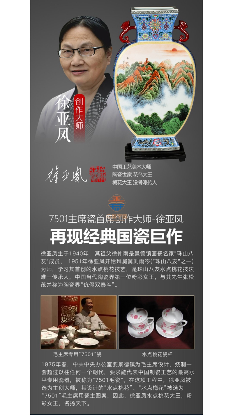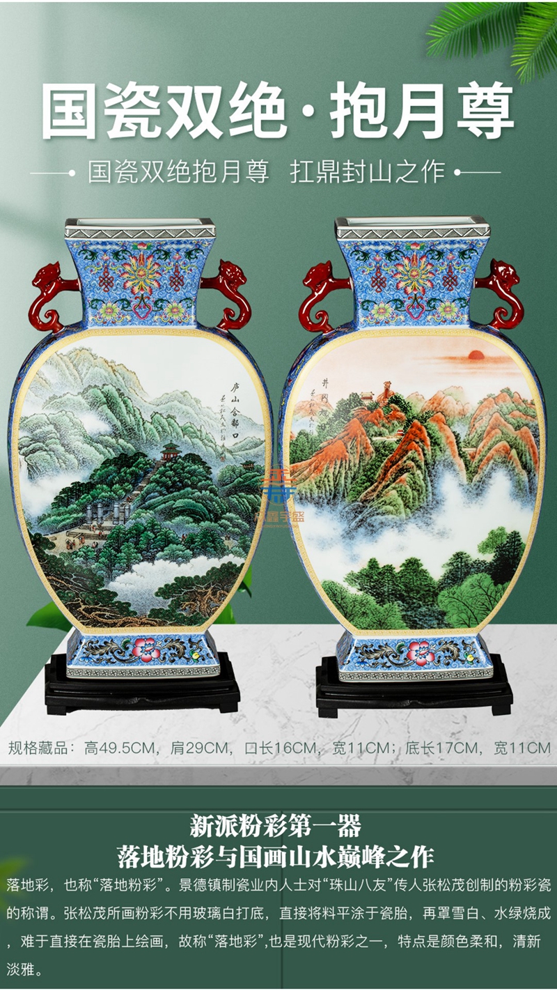 陶瓷泰斗张松茂、徐亚凤创作国瓷双绝·抱月尊 新派粉彩第一器落地粉彩与国画山水巅峰之作落地彩,也称“落地粉彩”。景德镇制瓷业内人士对“珠山八友”传人张松茂创制的粉彩瓷的称谓。张松茂所画粉彩不用玻璃白打底,直接将料平涂于瓷胎,再罩雪白、水绿烧成难于直接在瓷胎上绘画,故称“落地彩”,也是现代粉彩之一,特点是颜色柔和,清新淡雅。