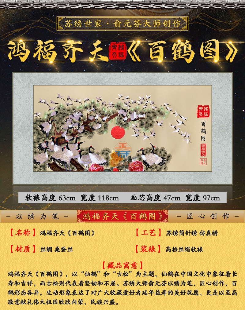 【名称】:鸿福齐天《百鹤图》 鸿福齐天《百鹤图》,以“仙鹤”和“古松”为主题,仙鹤在中国文化中象征着长寿和吉祥,而古松则代表着坚韧和不屈。苏绣大师俞元芬以绣为笔,匠心创作,百鹤形态各异,生动形象表达了对广大收藏爱好者延年益寿的美好祝愿、更是以至高敬意献礼伟大祖国欣欣向荣,民族兴盛。