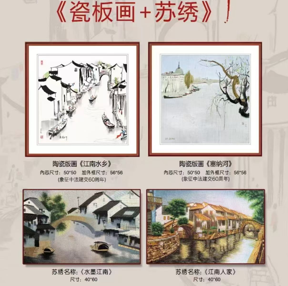 吴冠中非遗国礼双绝《瓷板画+苏绣》江南水乡 塞纳河 水墨江南 江南人家 陶瓷版画《江南水乡》规格:56*56cm 陶瓷版画《塞纳河》规格:56*56cm 苏绣《水墨江南》规格:40*60cm