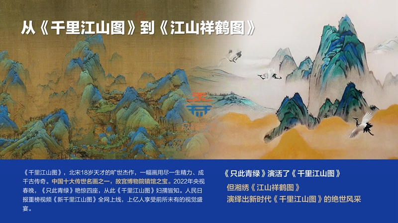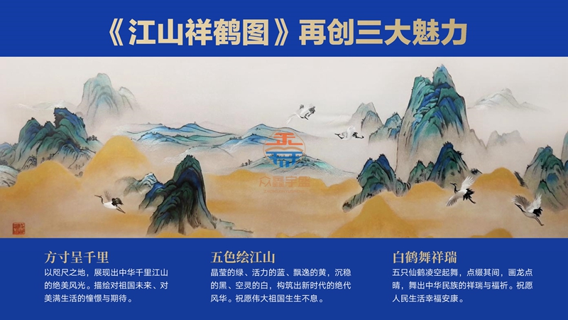 《江山祥鹤图》作品以国宝名画“千里江山图’局部山势重构,层峦起伏的群山间,祥鹤飞旋,营造出一幅气韵生动的青绿山水图卷,很好地传递了“绿水青山就是金山银山”的大国理念。