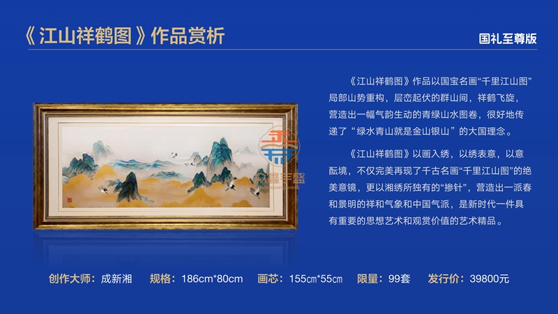 《江山祥鹤图》以画入绣,以绣表意,以意酝境,不仅完美再现了千古名画“千里江山图”的绝美意镜,更以湘绣所独有的“掺针”,营造出一派春和景明的祥和气象和中国气派,是新时代一件具有重要的思想艺术和观赏价值的艺术精品。