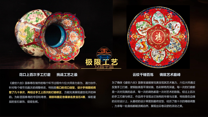 《盛世六合》是刘永森大师与钟连盛、米振雄、戴嘉林、金玉田、李荣魁六位景泰蓝国宝宗师共同创作的作品,曾获得法国和迪拜两项世界级艺术大奖。同时在中塞建交50周年这一历史性节点,作为至高规格的国礼入驻珐琅源起地塞浦路斯国家博物馆,意义非凡。 |