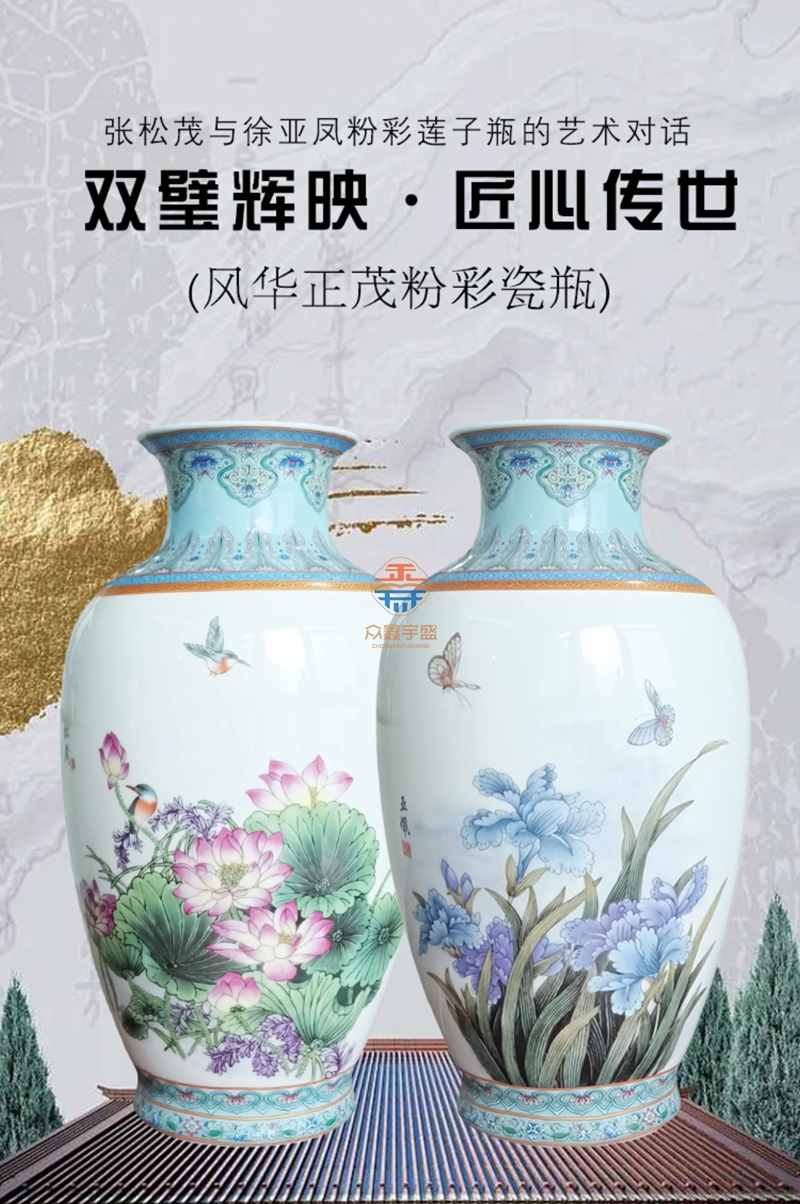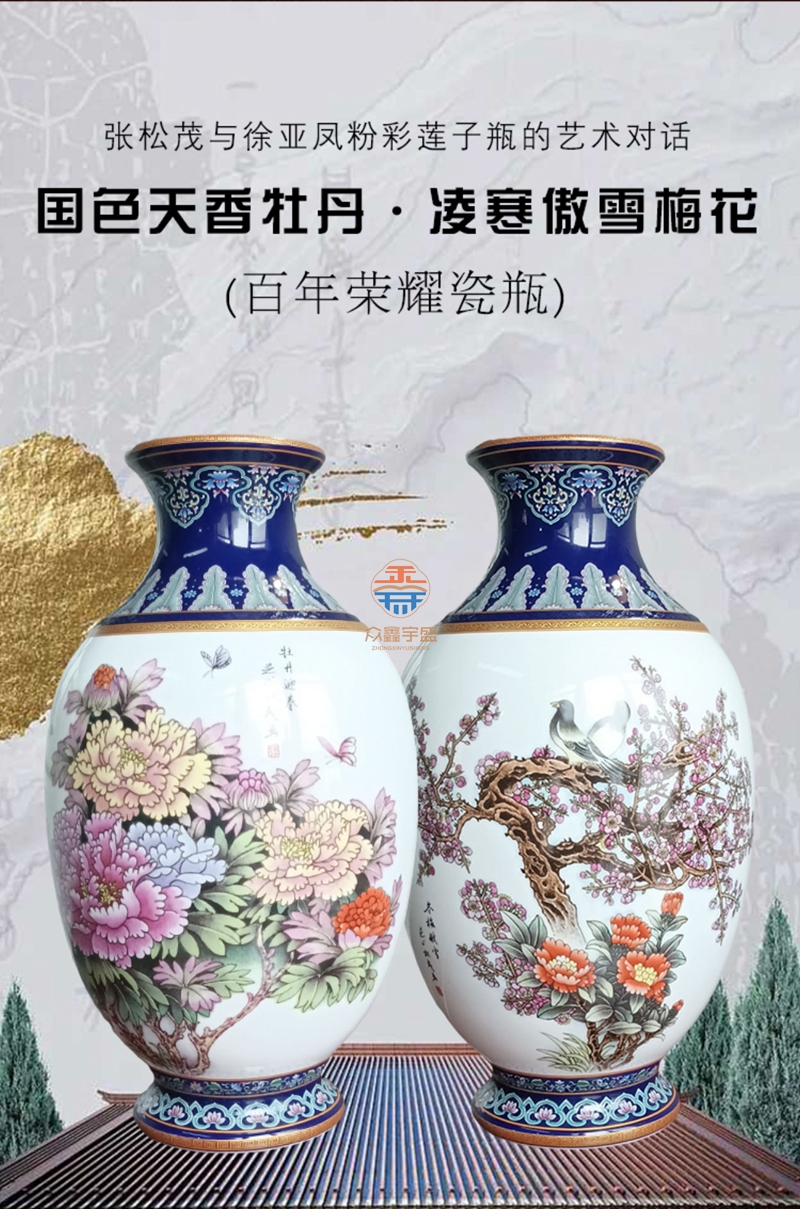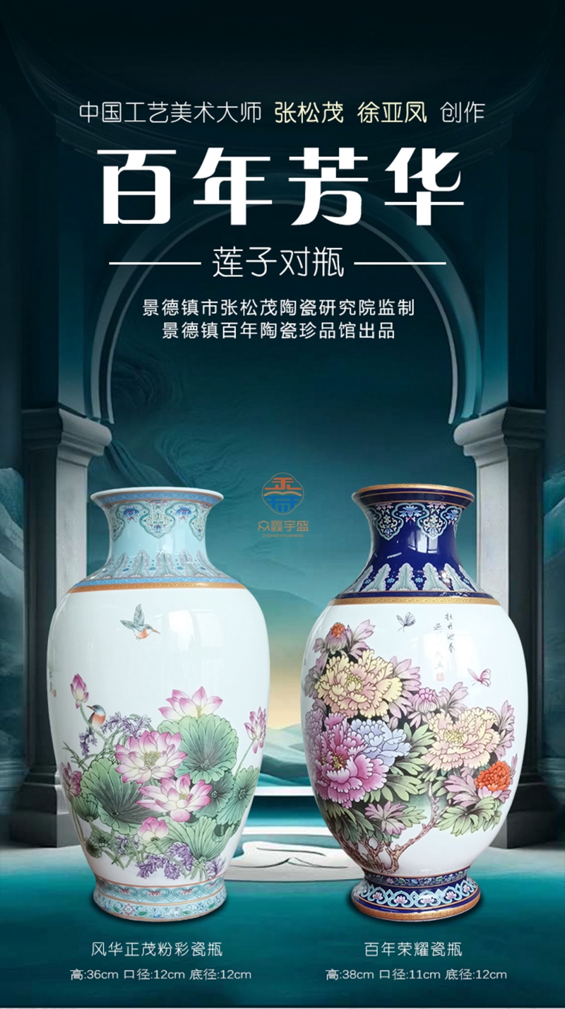 【瓷器名称】百年芳华莲子对瓶 【创作大师】张松茂,徐亚凤 (瓷器监制】景德镇市张松茂陶瓷研究院监制 【瓷器出品】景德镇百年陶瓷珍品馆出品 【藏品器型】莲子瓶 【风华正茂】高:36cm 口径:12cm 底径:12cm 【百年荣耀】高:38cm 口径:11cm 底径:12cm