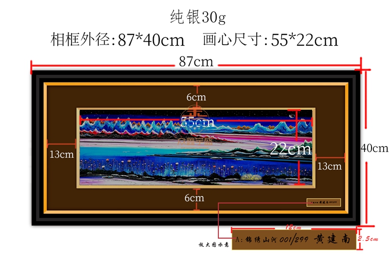 黄建南大师从艺七十载的历史坐标上,这件融合东方美学精粹与现代金属工艺的《锦绣山河》银版画应运而生。作品由黄建南亲自设计监制,领衔工作室团队共同创作而成以黄建南拍卖成交价最高的油画作品《锦绣前程》为创作蓝本30克999纯银为载体,通过高端制银工艺技术与传统刻印彩工艺的完美结合,将黄建南七十年来积淀的山水意境转化为永恒金属记忆。