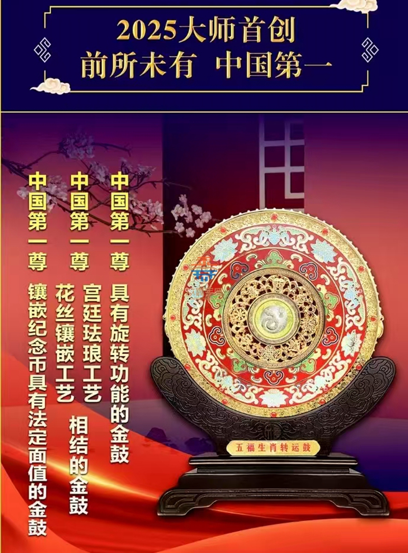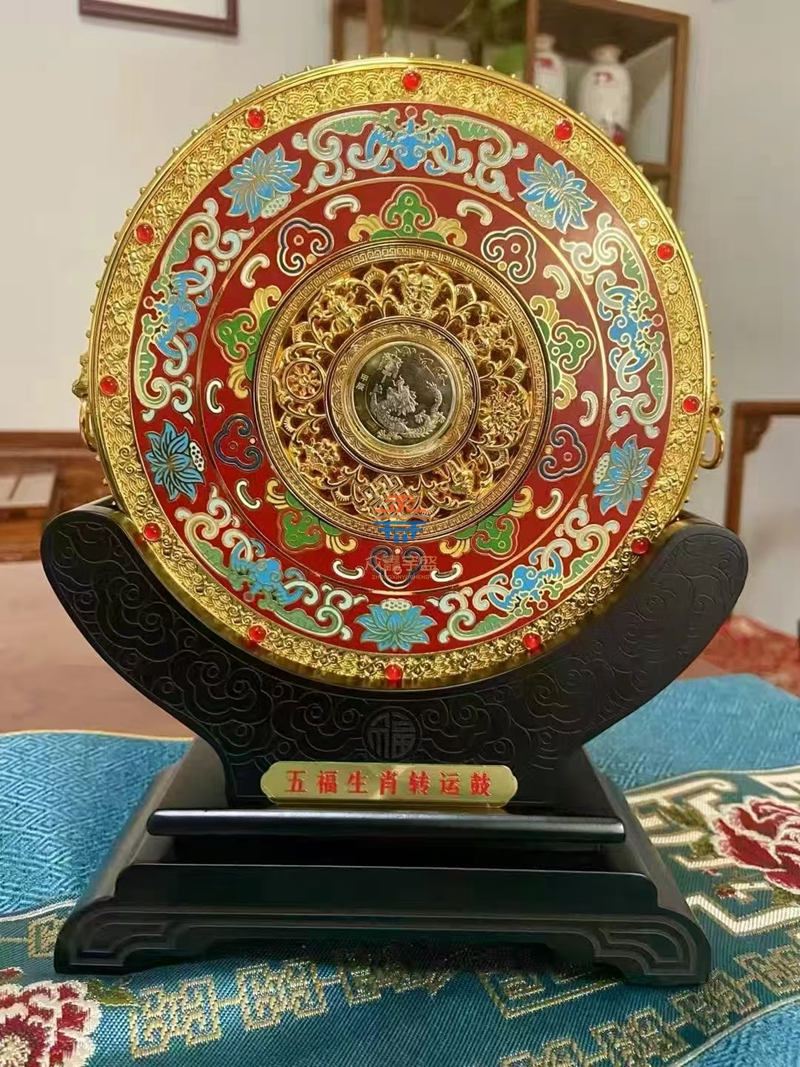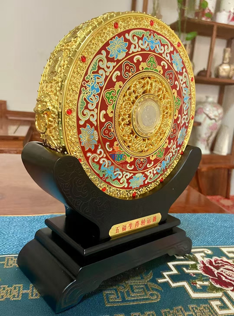 《五福生肖转运鼓》中国第一尊以珐琅工艺与花丝工艺相结合的金鼓,中国第一尊具有旋转功能的金鼓,中国第一尊镶嵌生肖纪念币,具有法定面值的金鼓。丁明鸿大师首创 鼓,寓意一鼓作气,一鸣惊人。《五福生肖》转运鼓由工艺美术大师丁明鸿设计完成,鼓身采用了稀有的合金材质,侧面和背面鼓面纹饰以花丝霉刻工艺完成,正面鼓面以花丝镶嵌工艺与宫廷珐琅工艺相结合制作完成,在中心位置镶嵌2025年蛇生肖流通币一枚,币外围装配整刻镂空的吉祥八宝纹转运轮,用手轻轻拨弄便会围绕生肖币飞速旋转,寓意吉祥八宝时时庇护,护佑蛇年转运,福运连绵。《五福生肖》转运鼓通体鎏金,共计耗999足金10毫克,鼓身纹饰精美,结构巧妙,寓意祥瑞,配以精美底座,皮箱包装,限量制作3000套,具有很高的工艺价值和鉴赏价值。