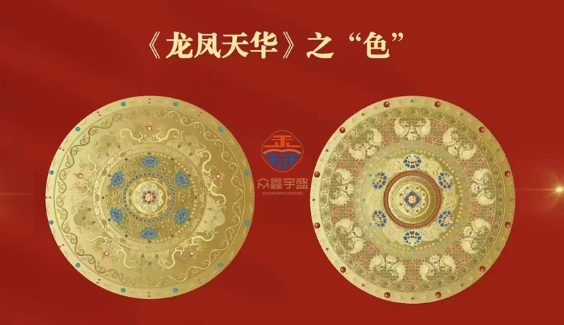 《龙凤天华》设计理念龙凤对盘的整体设计是常沙娜先生。基于她过去80年来对中国传统纹样。以及对敦煌图案装饰的研究和梳理。所以说在选取图案。再到设计整个盘的结构上面。都是符合我们这次世博会中国馆“天人合一”的思想。每一个盘里至少有八层的纹样结构在里面。所以图案非常丰富。寓意也是一个非常吉祥的象征。