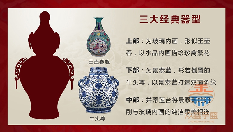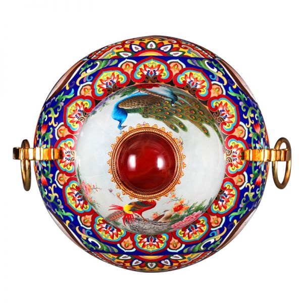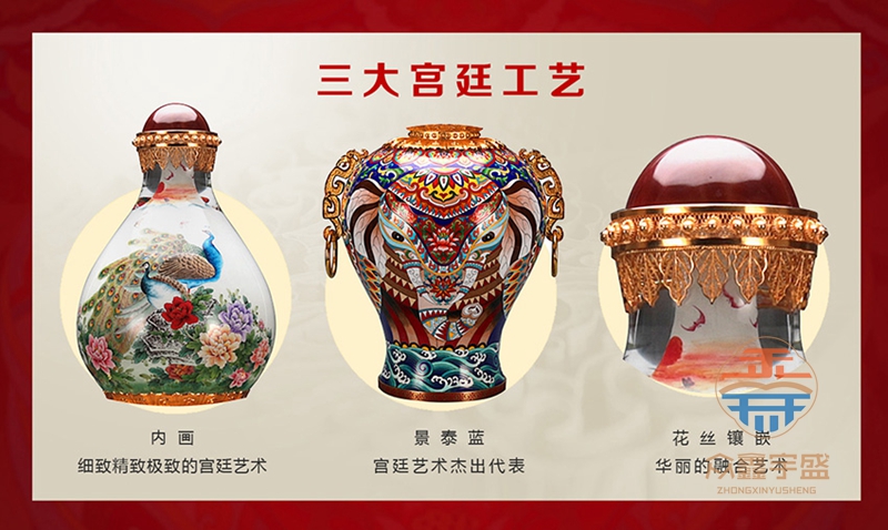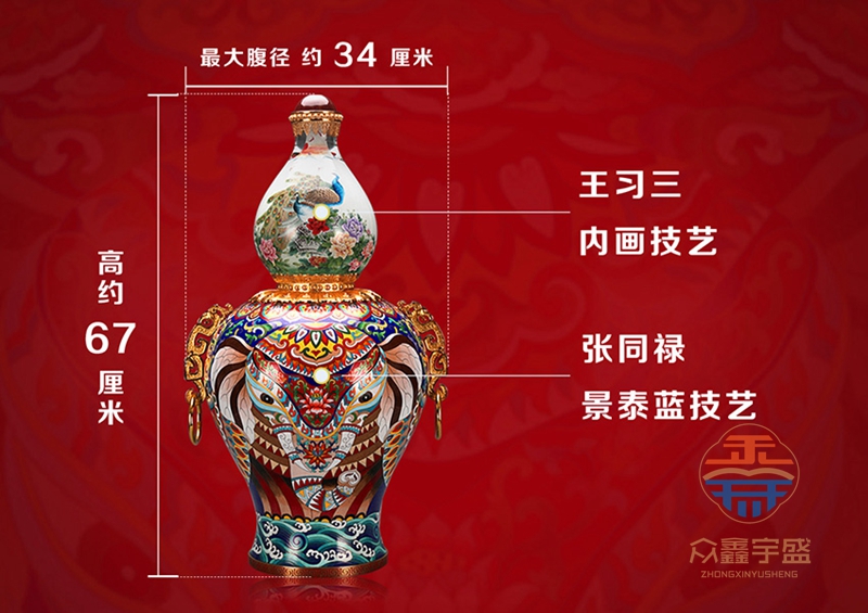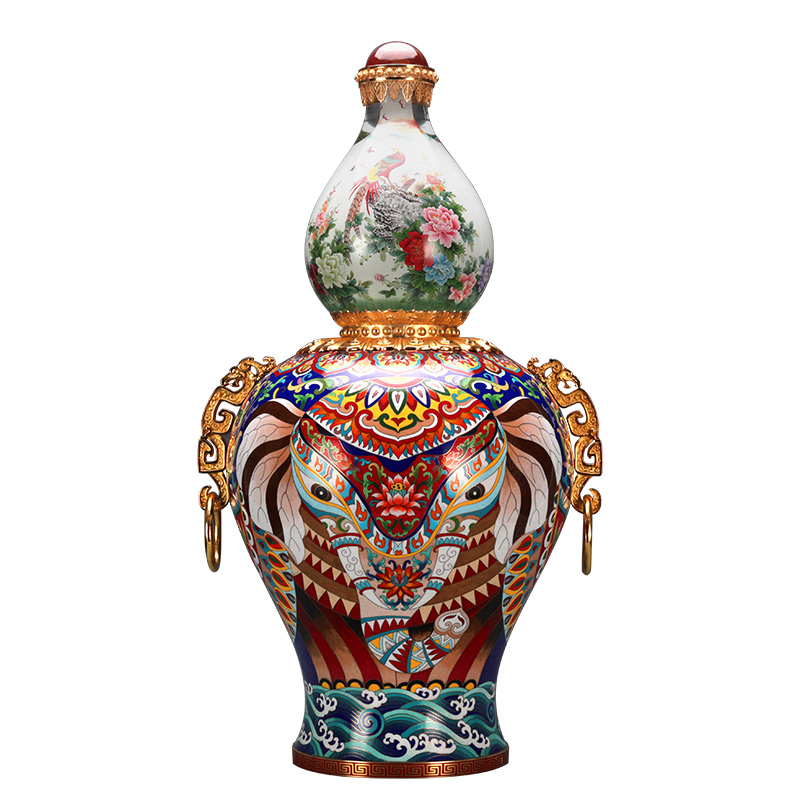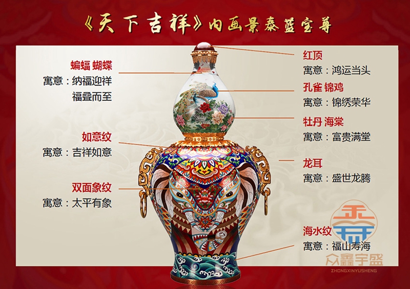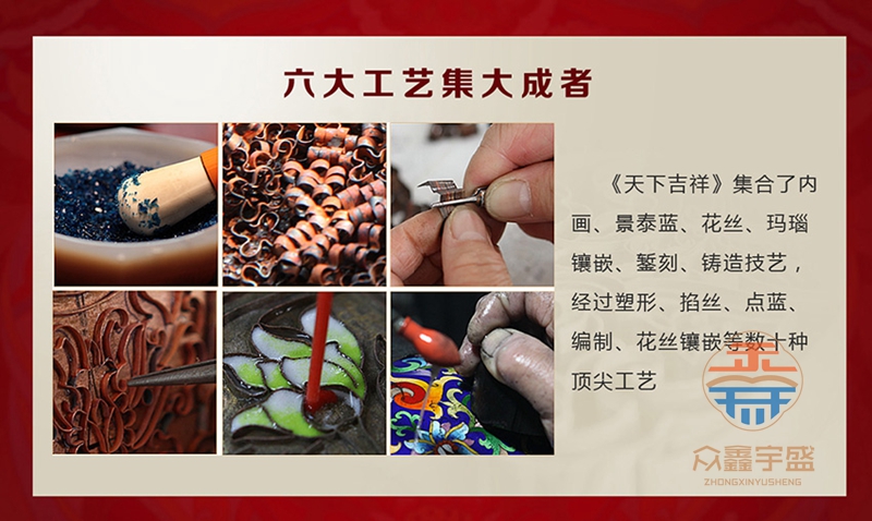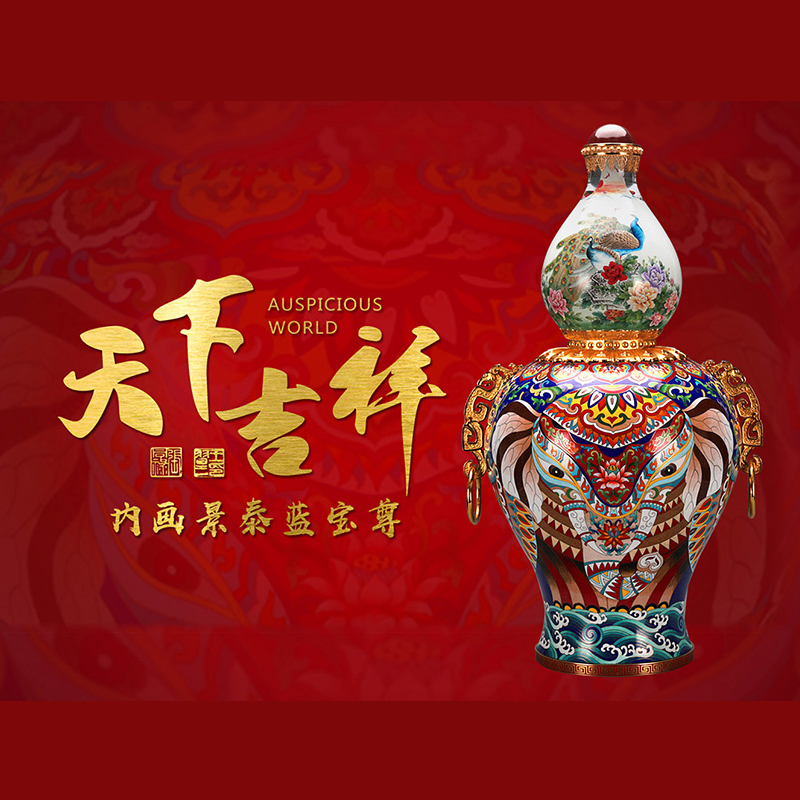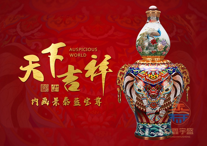 《天下吉祥》内画景泰蓝宝尊,集合了内画、景泰蓝、花丝、玛瑙镶嵌、錾刻、铸造技艺、经过塑形、掐丝、点蓝、编制、花丝镶嵌等数十种顶尖工艺。 高约67cm,腹径约34cm;张同禄和王习三的跨界作品,集经典器型、丰富内涵、多重技艺之大成的罕世瑰宝。