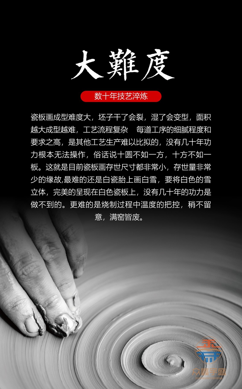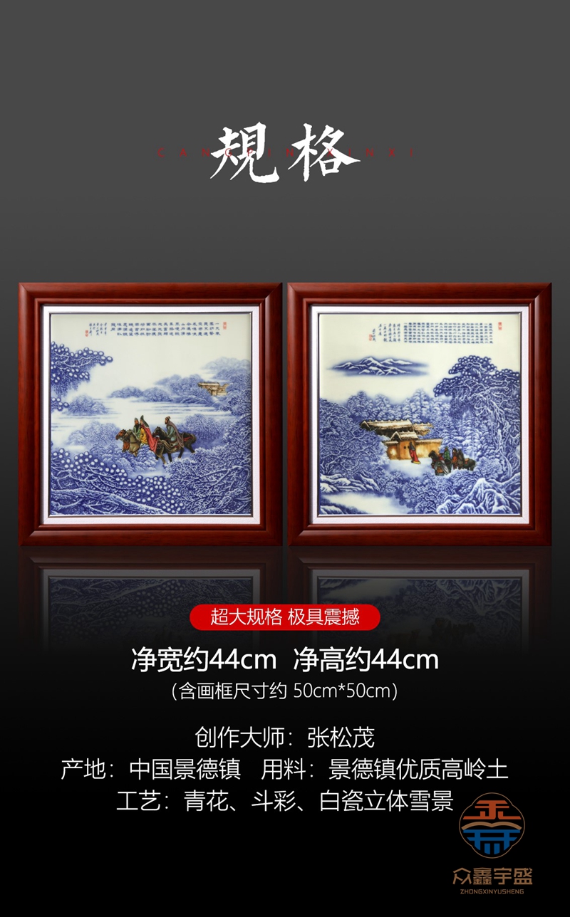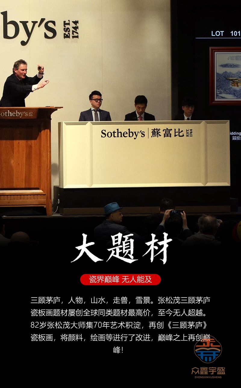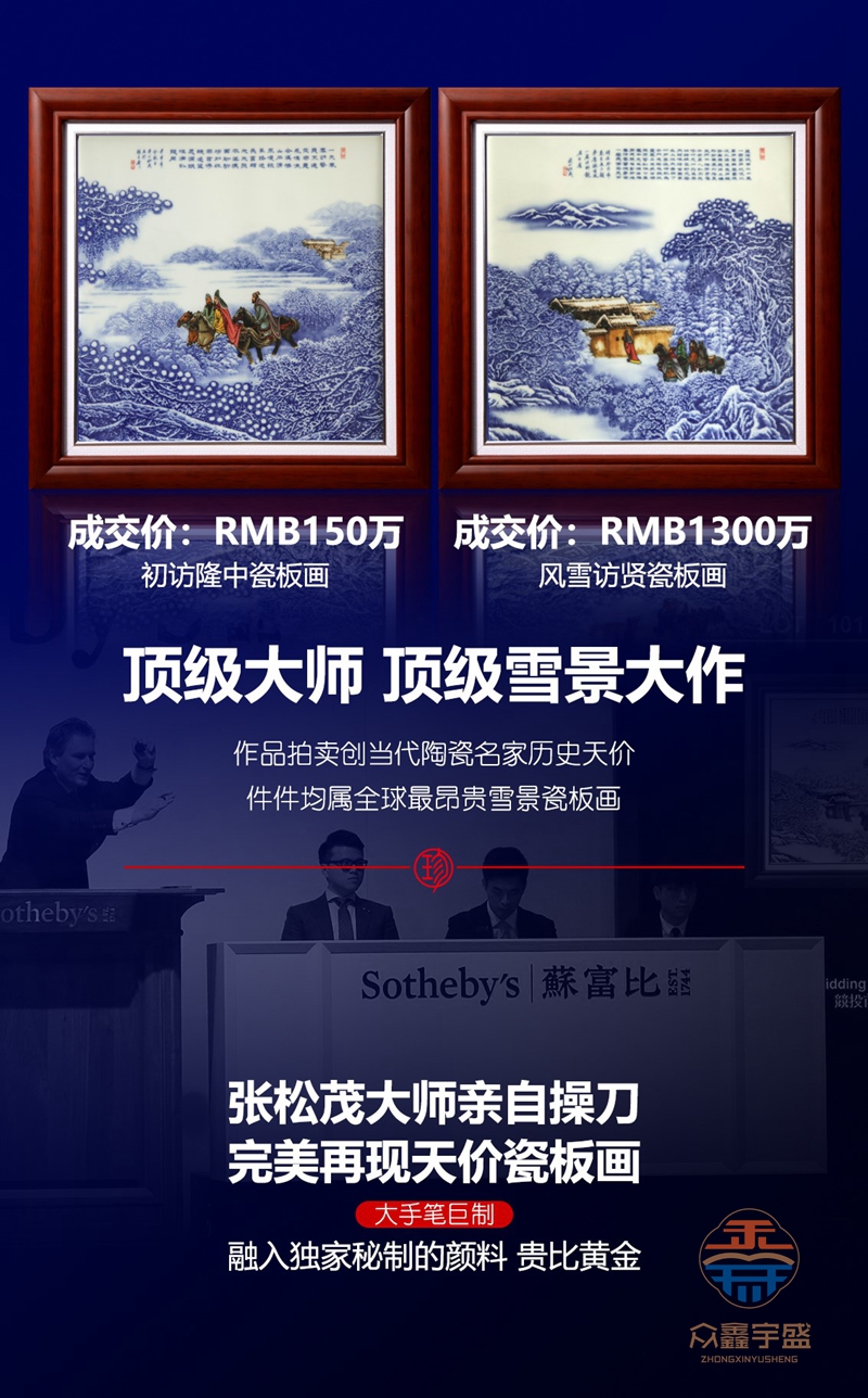 作品融诗,书,画,印,瓷于体,深刻的反映了张松茂大师炉火纯青的艺术造诣,全能型大师的称号实至名归。 三顾茅庐,人物,山水,走兽,雪景。张松茂三顾茅庐瓷板画题材屡创全球同类题材最高价,至今无人超越。82岁张松茂大师集70年艺术积淀,再创《三顾茅庐》瓷板画,将颜料,绘画等进行了改进,巅峰之上再创。