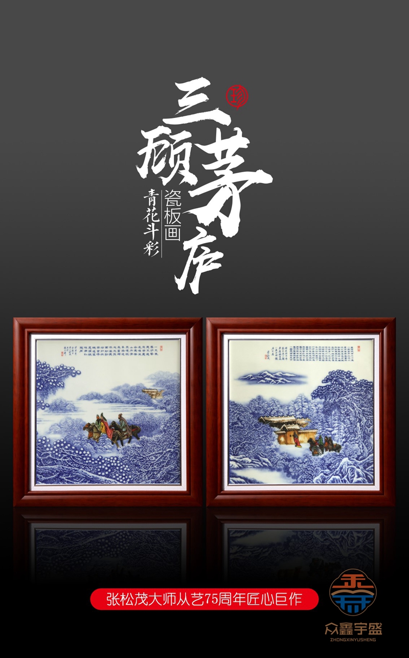 三顾茅庐,人物,山水,走兽,雪景。张松茂三顾茅庐瓷板画题材屡创全球同类题材最高价,至今无人超越。82岁张松茂大师集70年艺术积淀,再创《三顾茅庐》瓷板画,将颜料,绘画等进行了改进,巅峰之上再创。