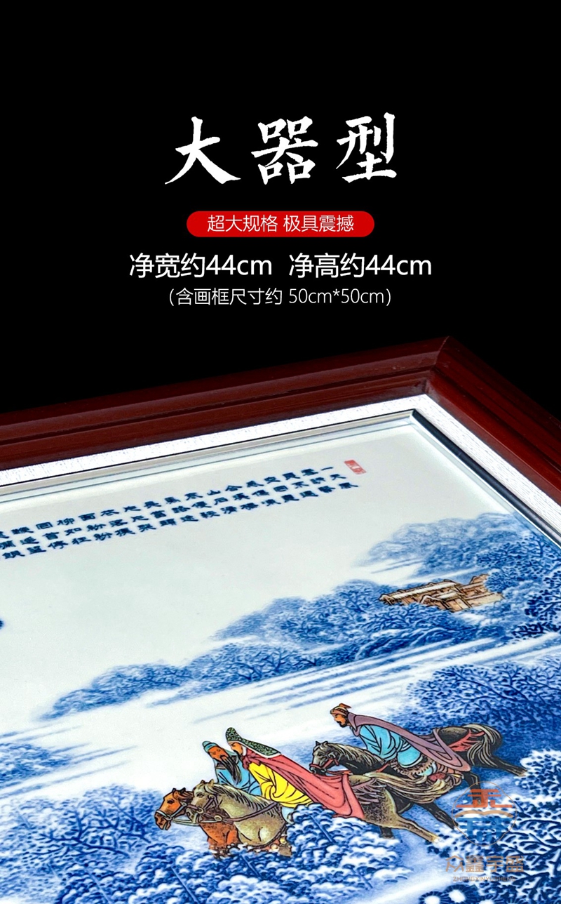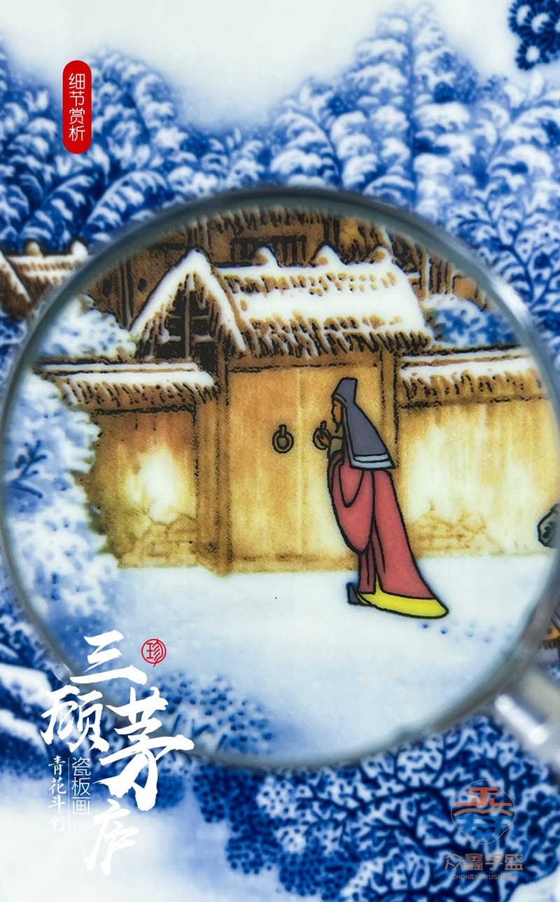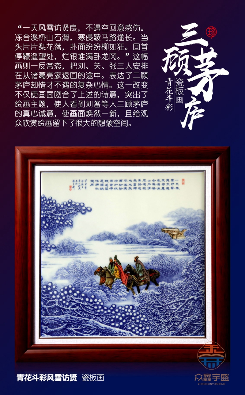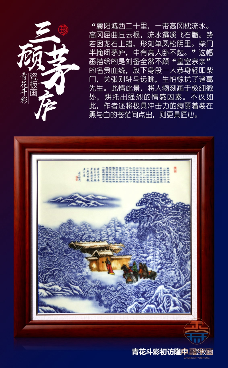 【藏品名称】:青花斗彩三顾茅庐瓷板画 【藏品工艺】:青花、斗彩、白瓷立体雪景
