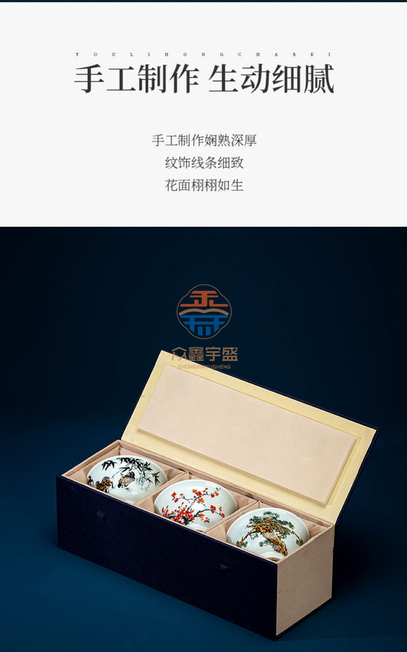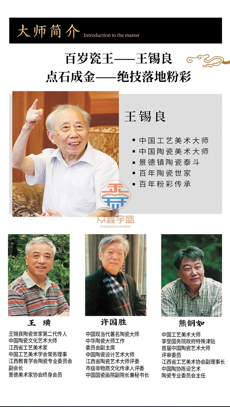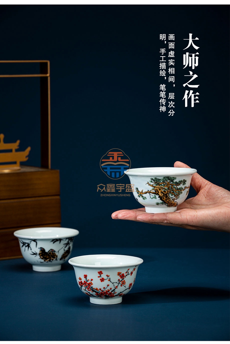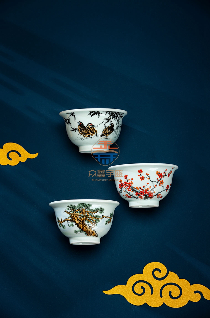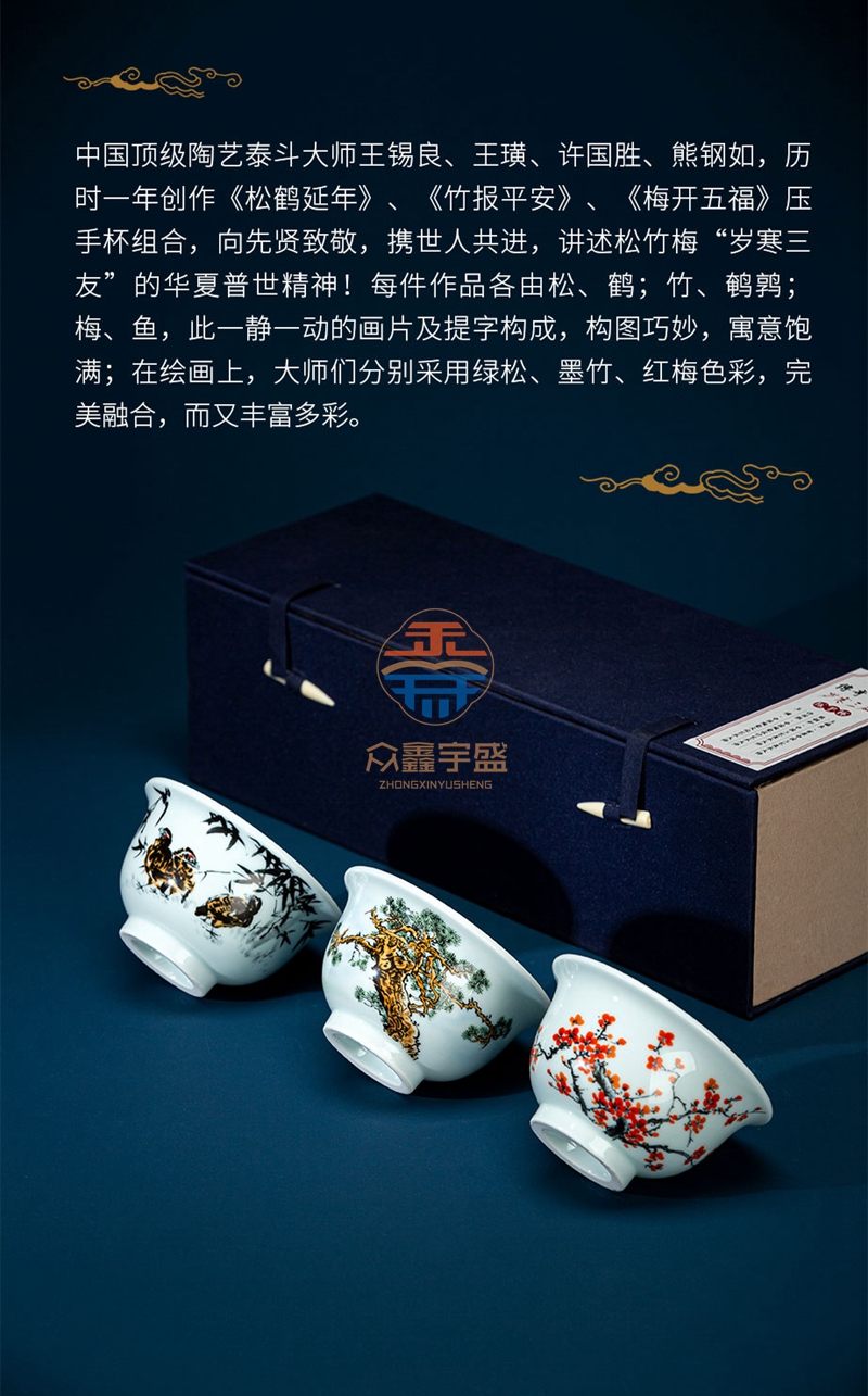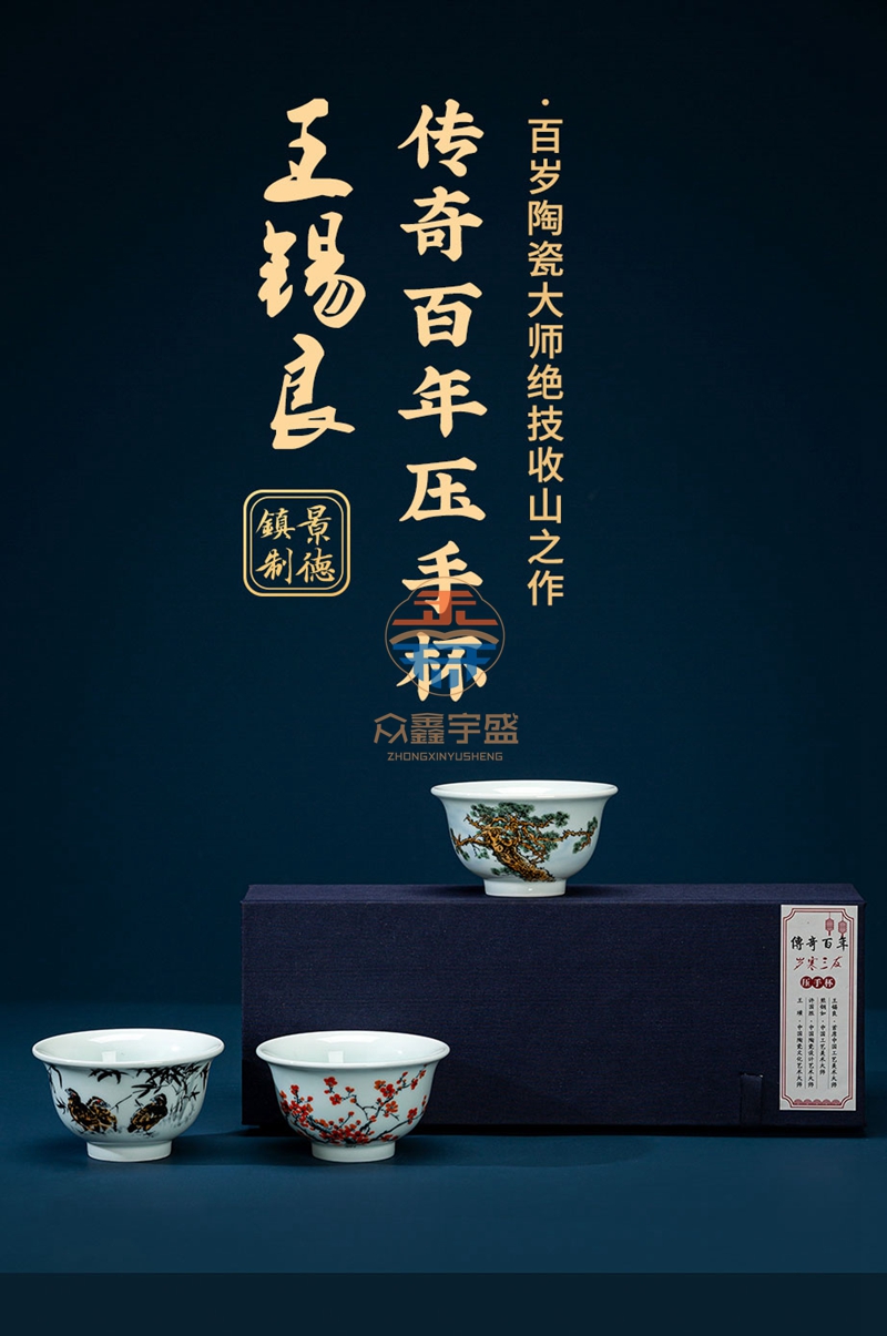 《传奇百年・岁寒三友》压手杯套组是王锡良大师生前最后一次参加雅集活动的亲创作品,参与集会创作的还有三位景德镇顶级陶瓷艺术家 四位国大师级别艺术家齐聚一堂,特别是国宝艺术家王锡良的参与,实属百年一见。