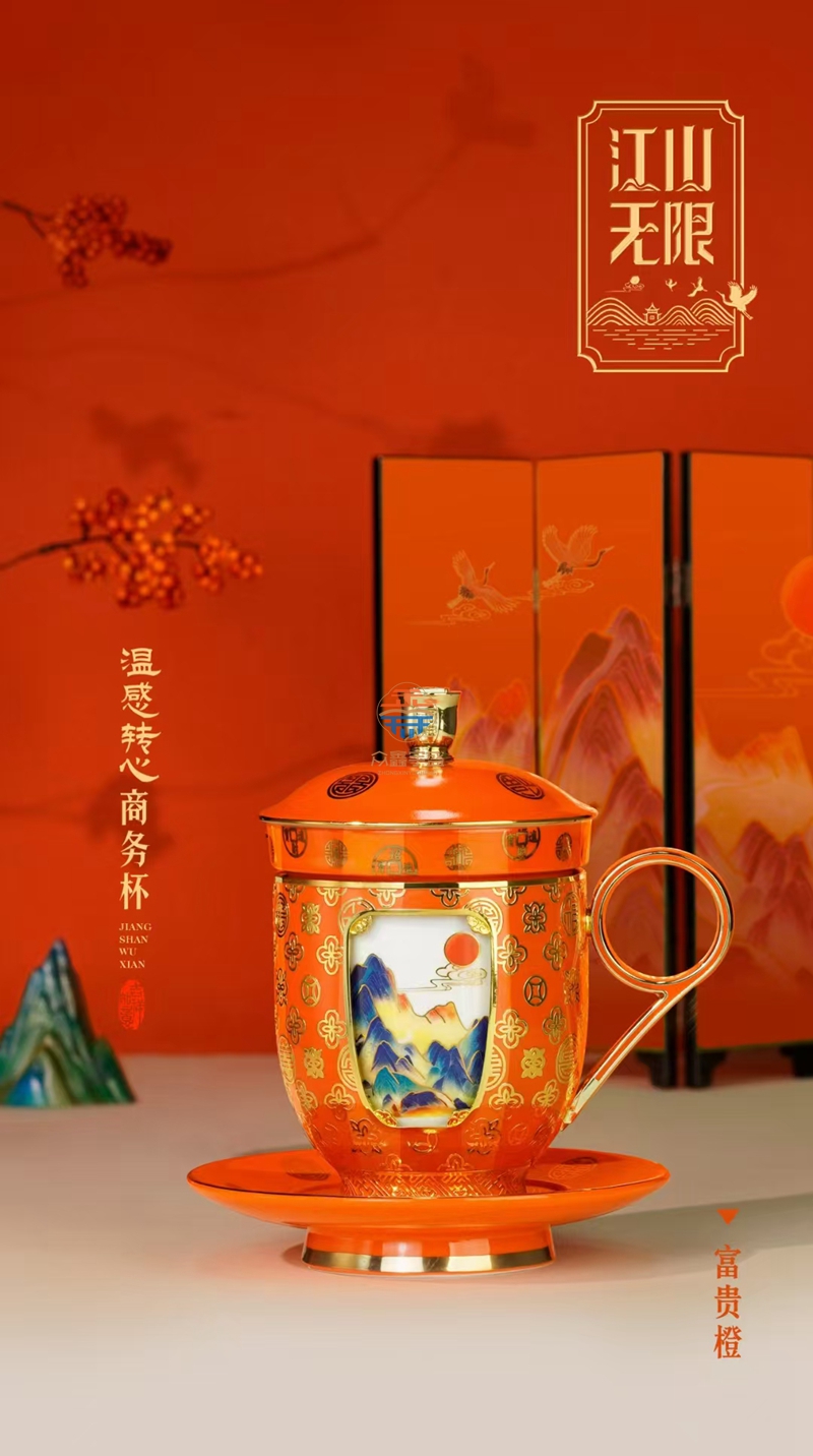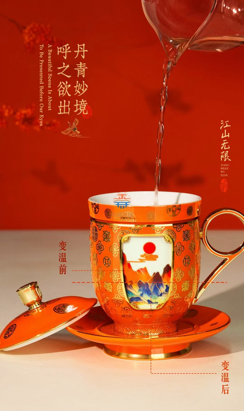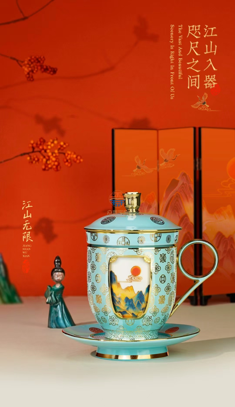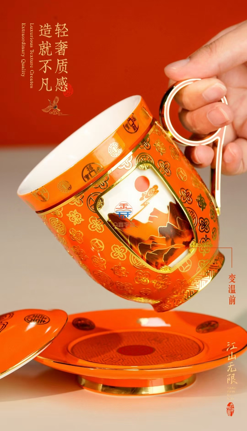 设计师以中国传统元素为主,在杯身上加入铜钱纹、钱币纹回形纹、福禄寿喜等富贵吉祥的图案。杯身陶瓷部分既可360度旋转,又可以在加入热水后,杯身图案立即发生变化,千里江山的美景,在杯身上徐徐展开,在品茗的同时又增加了赏玩性。<江山无限>商务杯在任何时候都能够体现您的独特品味,无论是享用美味佳肴或是精致的办公时光,都能让您每一天充满奢华和质感。