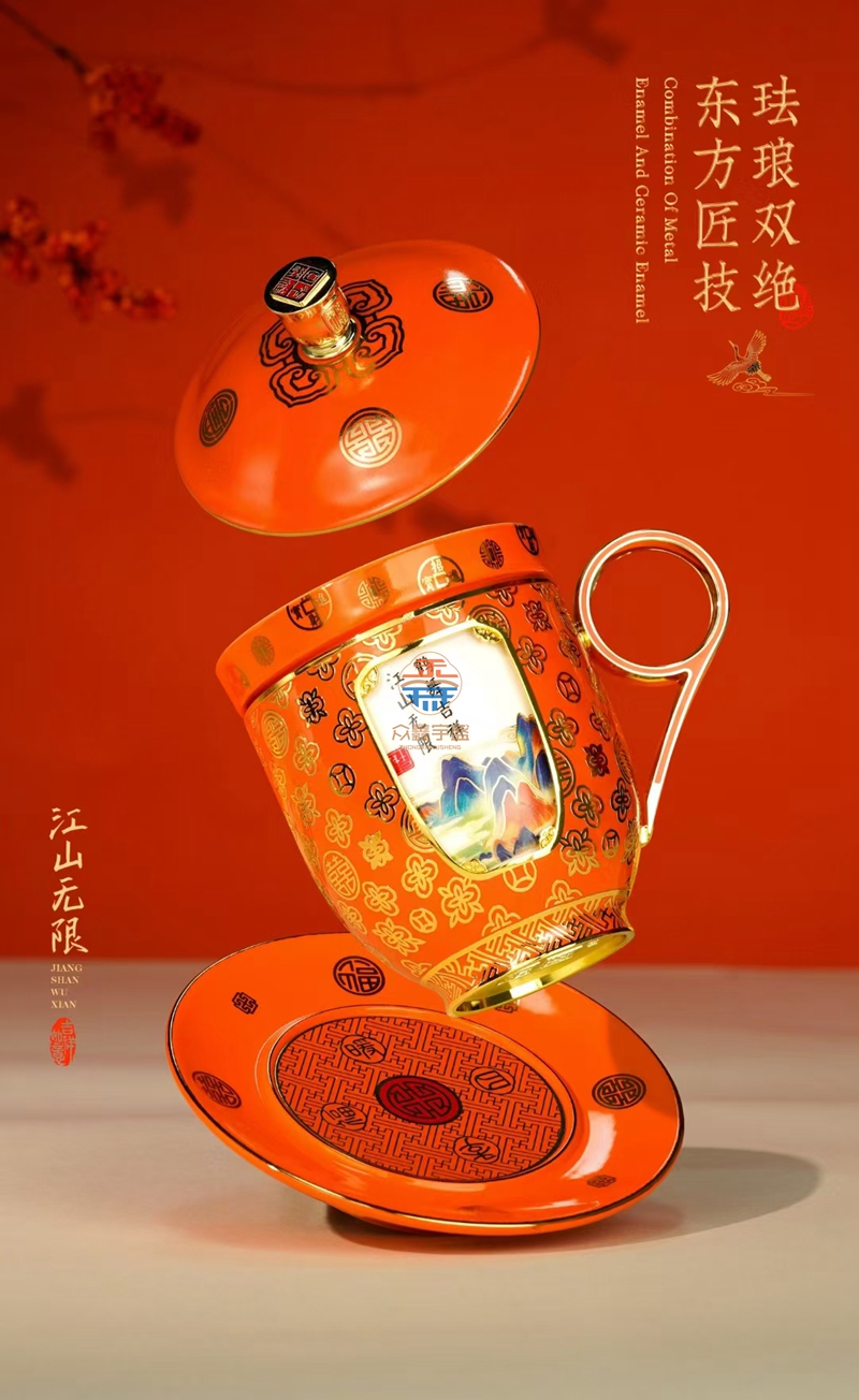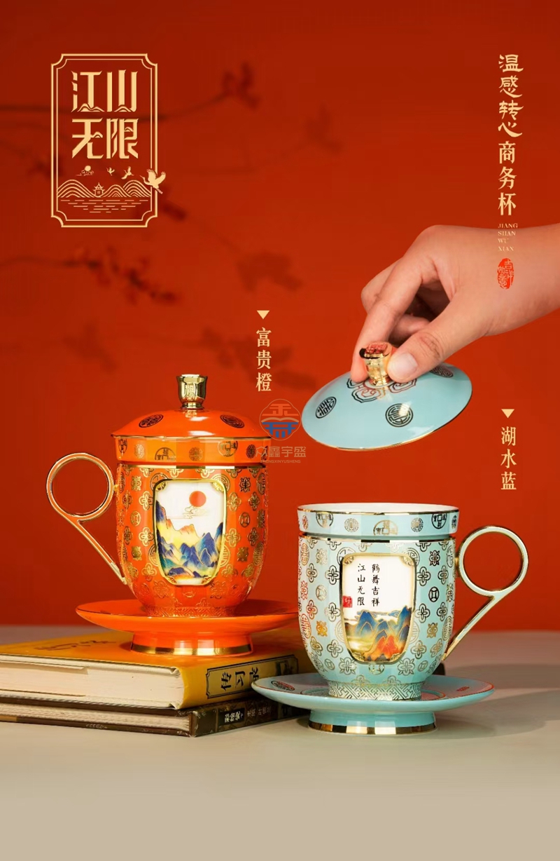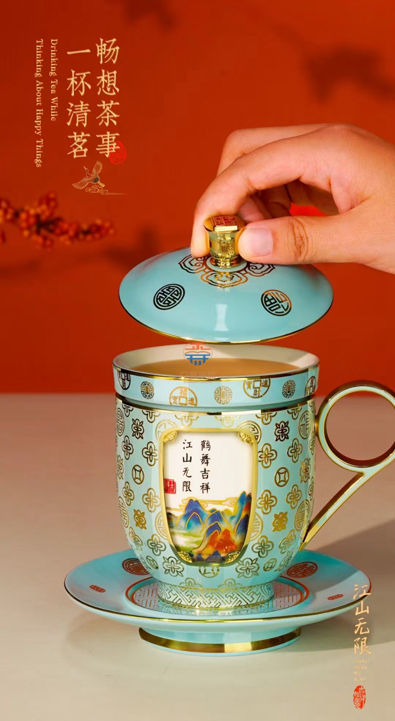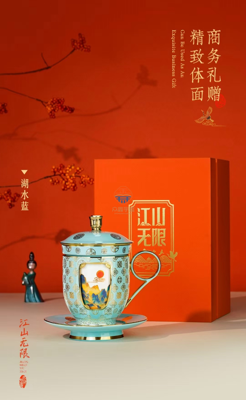 设计师以中国传统元素为主,在杯身上加入铜钱纹、钱币纹回形纹、福禄寿喜等富贵吉祥的图案。杯身陶瓷部分既可360度旋转,又可以在加入热水后,杯身图案立即发生变化,千里江山的美景,在杯身上徐徐展开,在品茗的同时又增加了赏玩性。<江山无限>商务杯在任何时候都能够体现您的独特品味,无论是享用美味佳肴或是精致的办公时光,都能让您每一天充满奢华和质感。