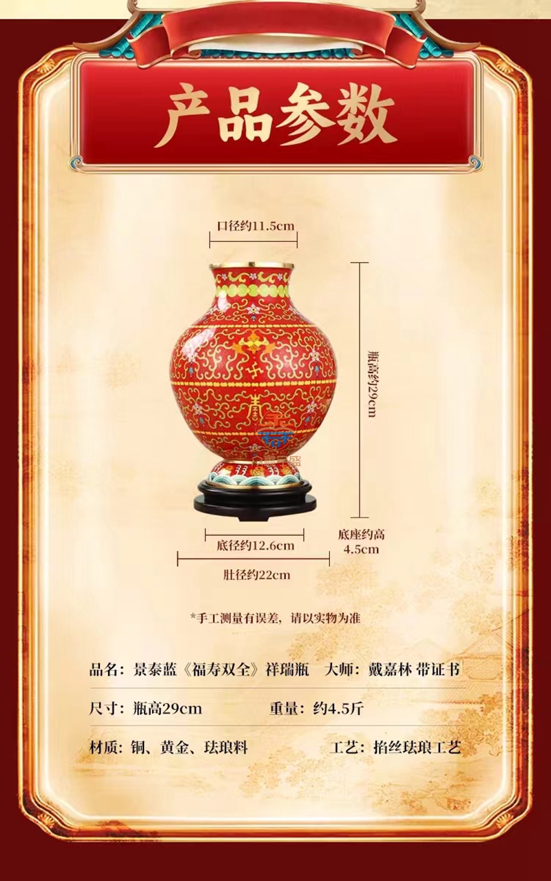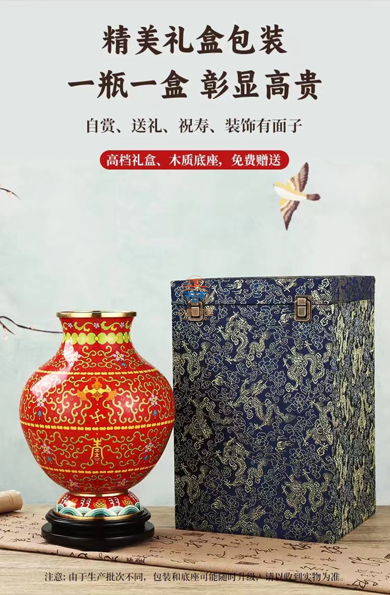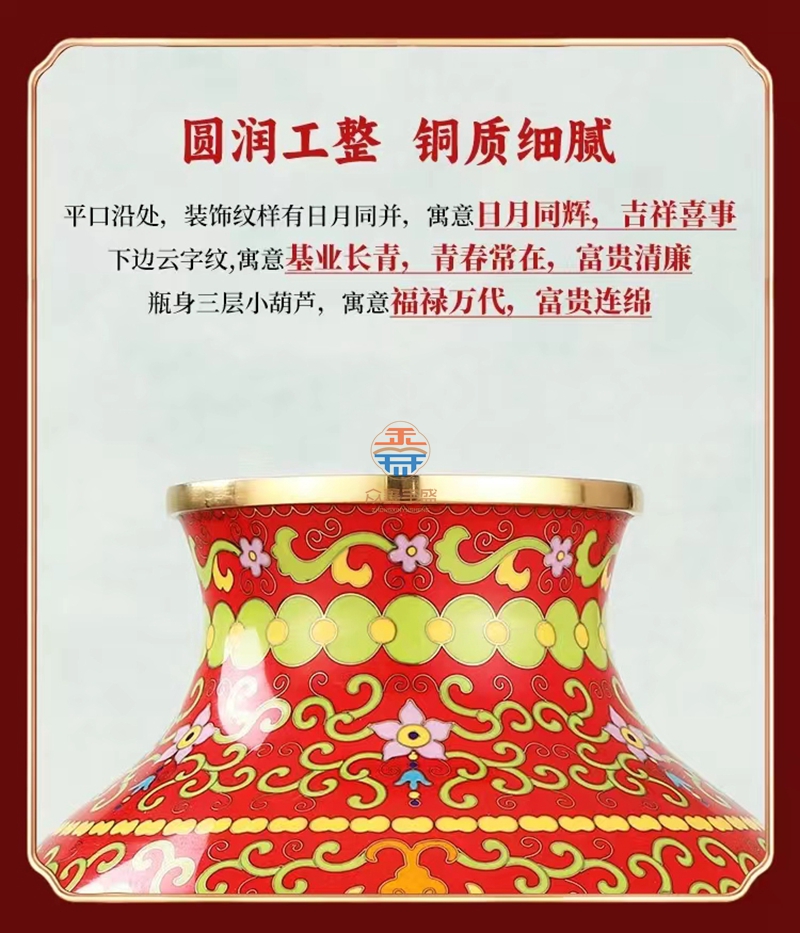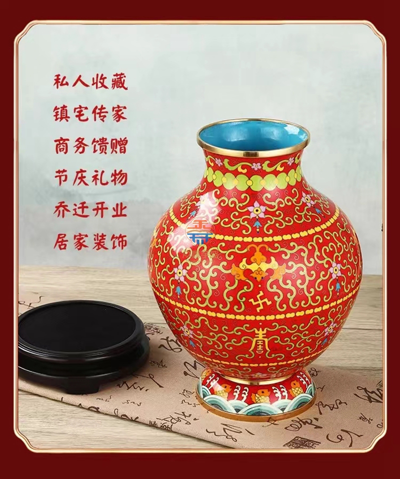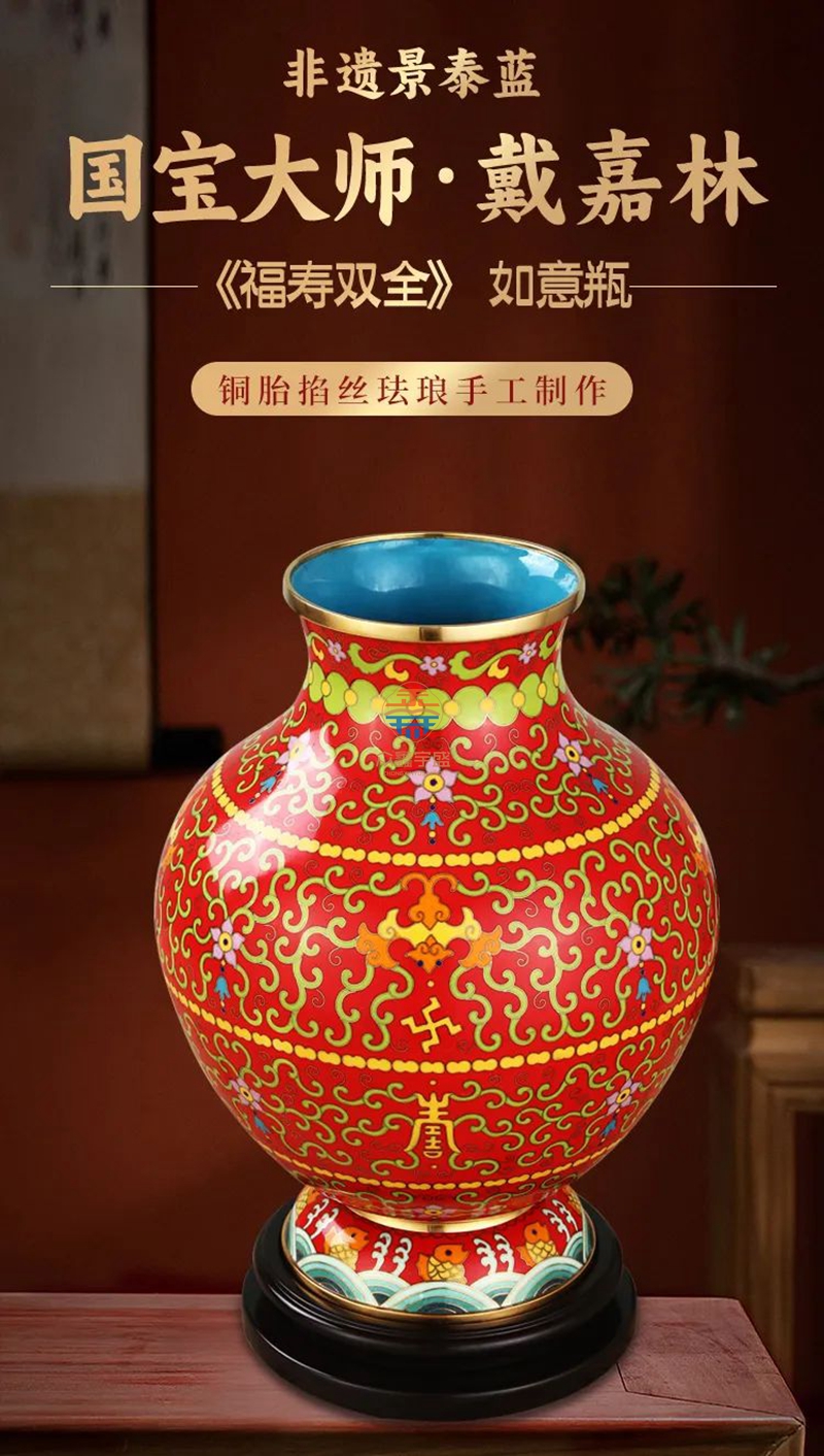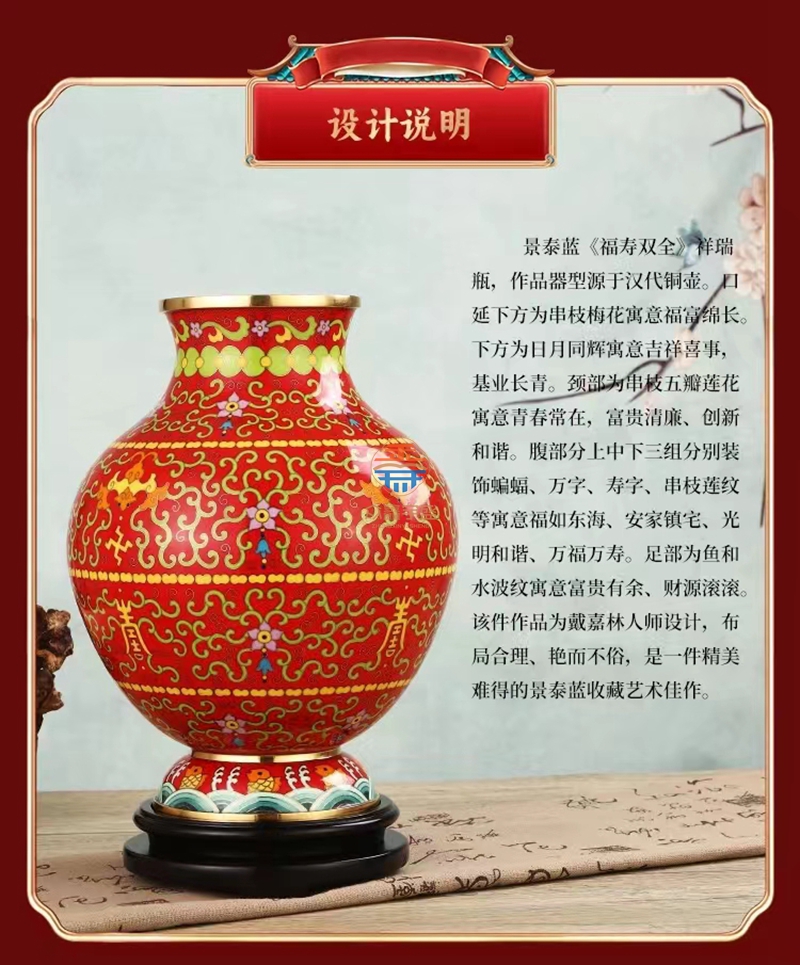 景泰蓝《福寿双全》祥瑞瓶,作品器型源于汉代铜壶。延下方为串枝梅花寓意福富绵长。下方为日月同辉寓意吉祥喜事,基业长青。颈部为串枝五瓣莲花寓意青春常在,富贵清廉、创新和谐。腹部分上中下三组分别装饰蝙蝠、万字、寿字、串枝莲纹等寓意福如东海、安家镇宅、光明和谐、万福万寿。足部为鱼和水波纹寓意富贵有余、财源滚滚该件作品为戴嘉林大师设计,布局合理、艳而不俗,是一件精美难得的景泰蓝收藏艺术佳作。