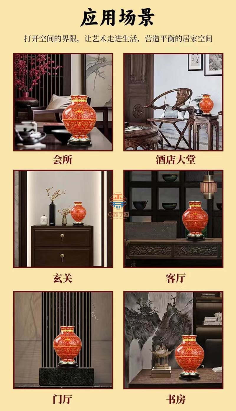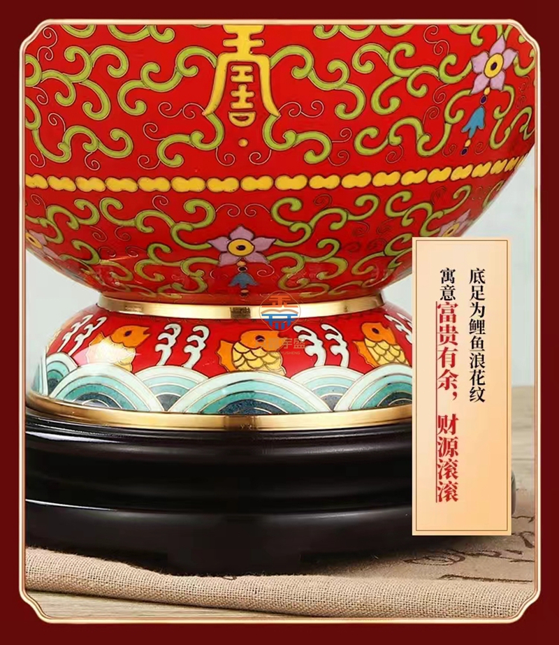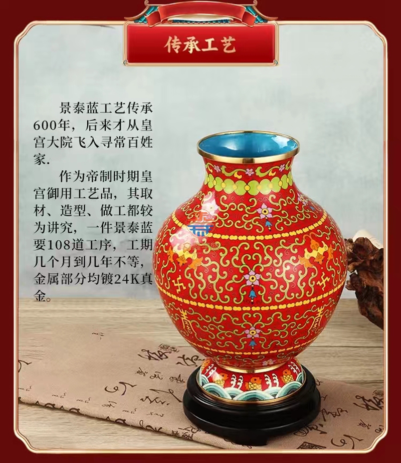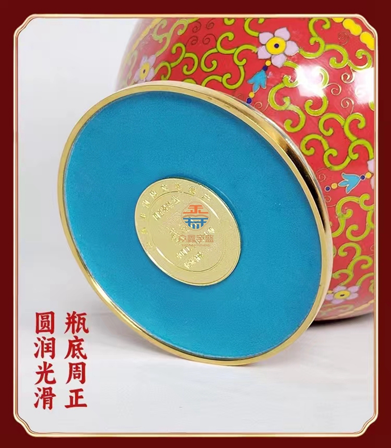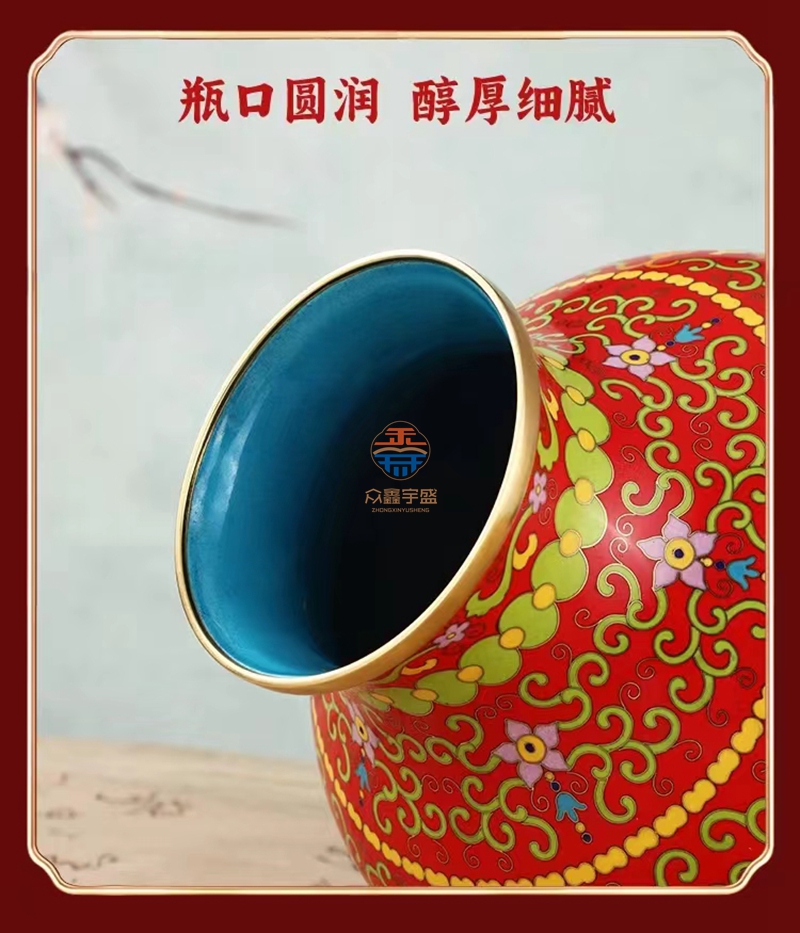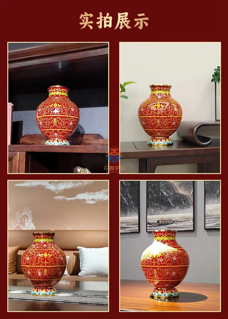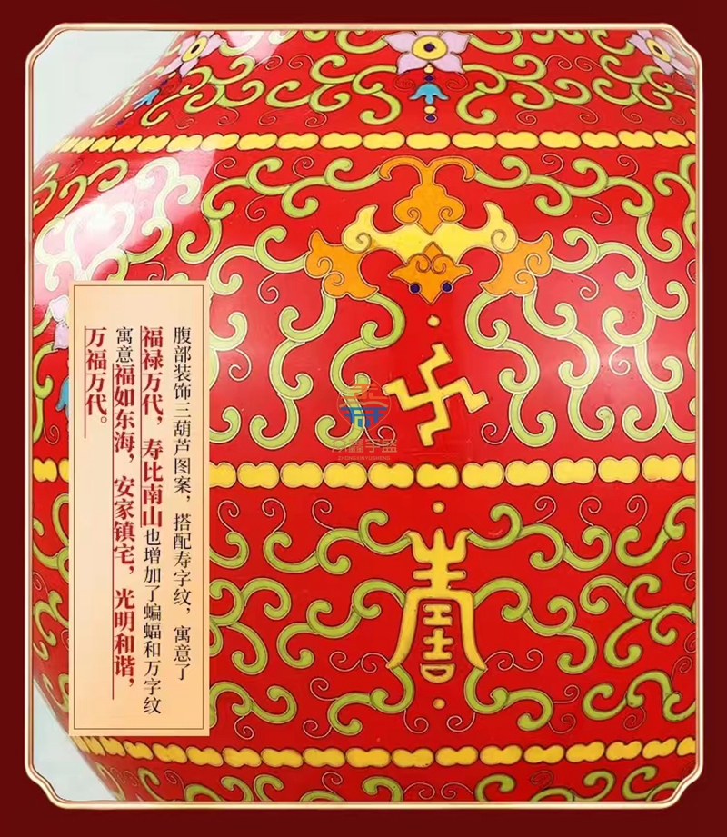 景泰蓝《福寿双全》祥瑞瓶,作品器型源于汉代铜壶。延下方为串枝梅花寓意福富绵长。下方为日月同辉寓意吉祥喜事,基业长青。颈部为串枝五瓣莲花寓意青春常在,富贵清廉、创新和谐。腹部分上中下三组分别装饰蝙蝠、万字、寿字、串枝莲纹等寓意福如东海、安家镇宅、光明和谐、万福万寿。足部为鱼和水波纹寓意富贵有余、财源滚滚该件作品为戴嘉林大师设计,布局合理、艳而不俗,是一件精美难得的景泰蓝收藏艺术佳作。